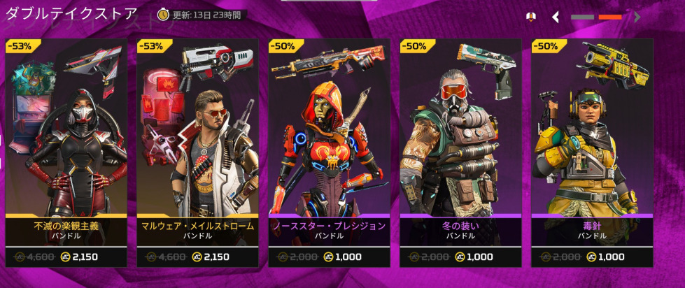 ストア情報【APEX】4.15ストア更新!ダブルテイクストア/ハイショットストア再販/リカラー/セレクトパック 2026年4月15日 2026年4月15日最新記事 【APEX】4.15ストア更新!ダブルテイクストア/ハイショットストア再販/リカラー/セレクトパック 【APEX】4月15日の修正アップデート 【APEX】新スパレジェが緊急発売開始!! 【APEX】4月15日リカラースキン情報 【ALGS】YEAR6 SP1 DAY3結果 4.15◆ダブルテイクストア◆ハイショットストア◆リカラー◆セレクトパックストア【APEX】新スパレジェが緊急発売開始!!2026.4.15【APEX】新スパレジェが緊急発売開始!! 登場が噂されていた2アイテムがストアに登場しました。 ◆メタリックバンシー ◆フリーティングウォリアー https://apexlege... Facebook Twitter