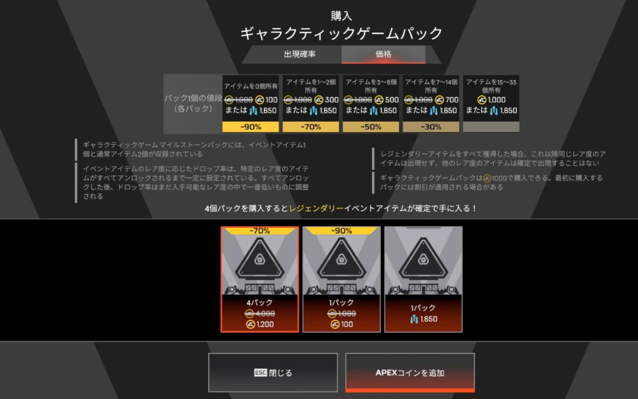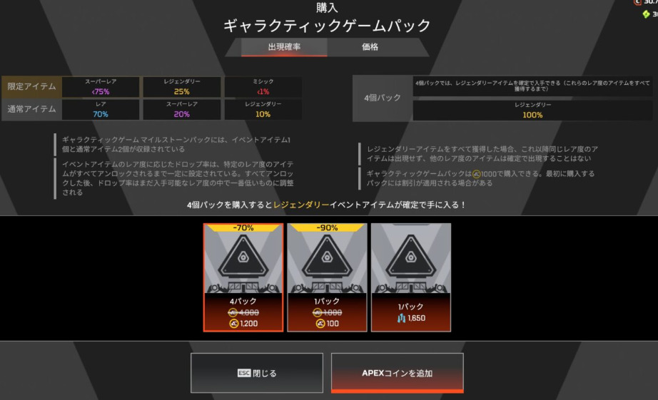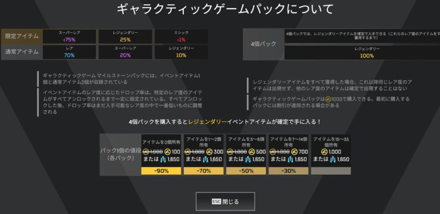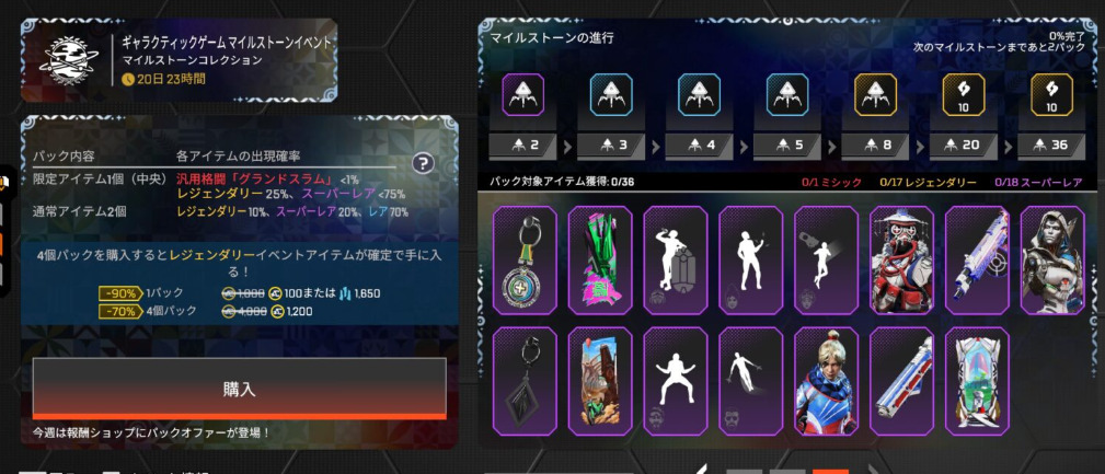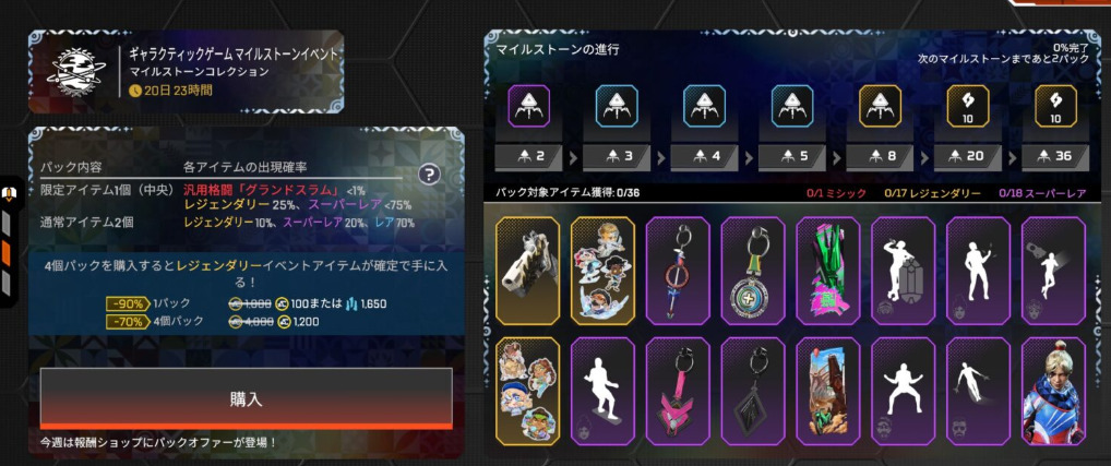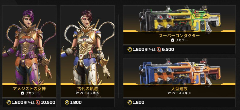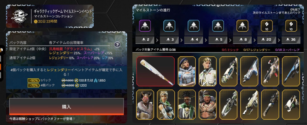 ストア情報【APEX】グランドスラム、新スキン、リカラーなどが登場0820ストア更新! 2025年8月20日 2025年8月20日最新記事 【APEX】覚醒コレクションイベント/リカラー11.12ストア情報(リーク) 【APEX】緊急修正対応が行われました(サーバー側) 【APEX】レイスのエターナルライフスキンが11.26に再販 【APEX】シーズン27開始で アクティブユーザー20万人/DAY回復 【APEX】ヴァルキリー&ホライゾンが大幅上昇!前シーズン強化のシアが1%割れ(新シーズン27開始後のピックランク) ストアが更新されバット型スパレジェ グランドスラム、新スキン、リカラーなどが登場◆ギャラクティックゲームイベント◆ギャラクティックゲームパック◆マイルストーンコレクション◆単品購入◆リカラー◆報酬ショップ Facebook Twitter