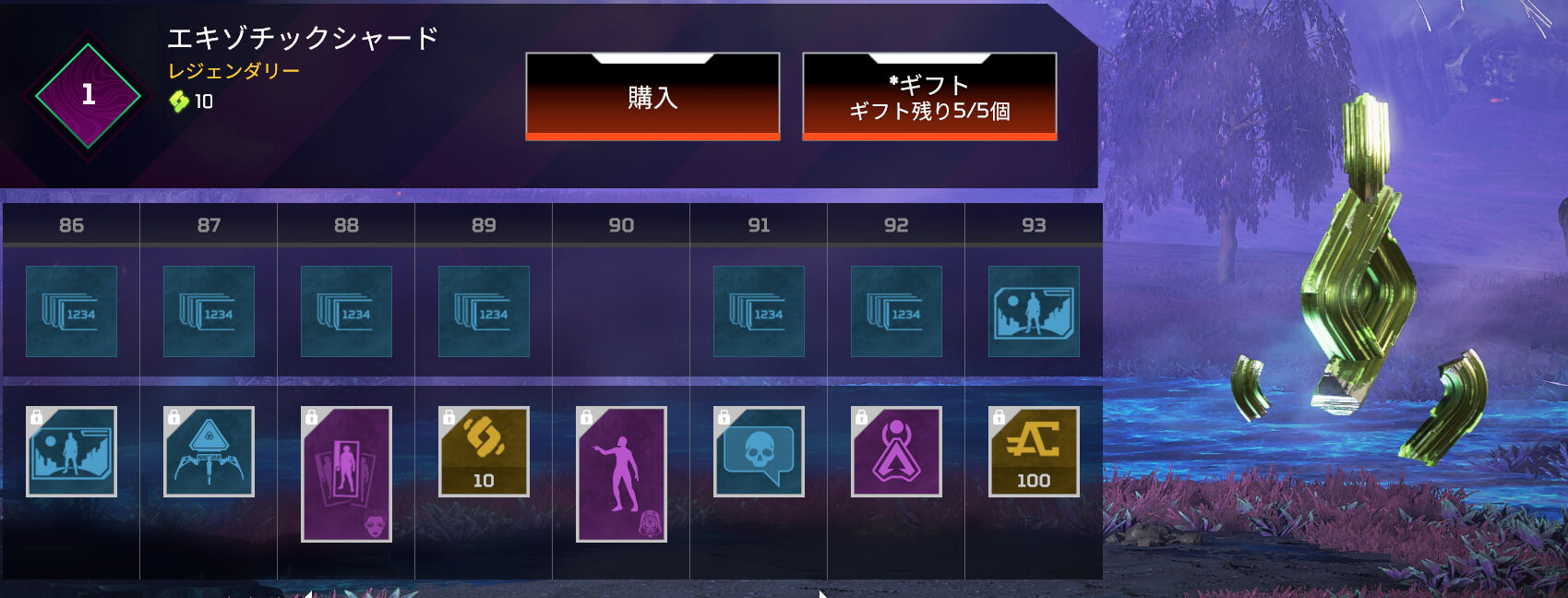シーズン21バトルパスを購入すると「バトルパスLv89」でエキゾチックシャードが10貰える