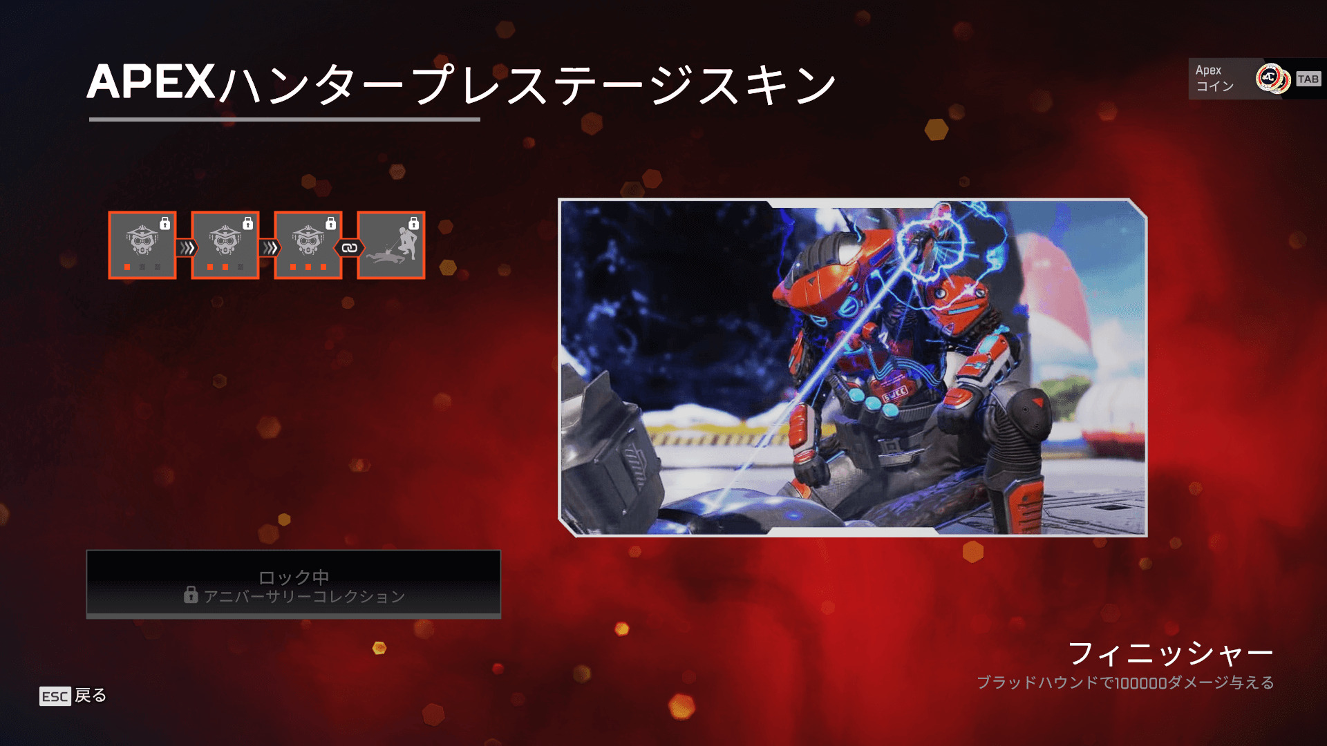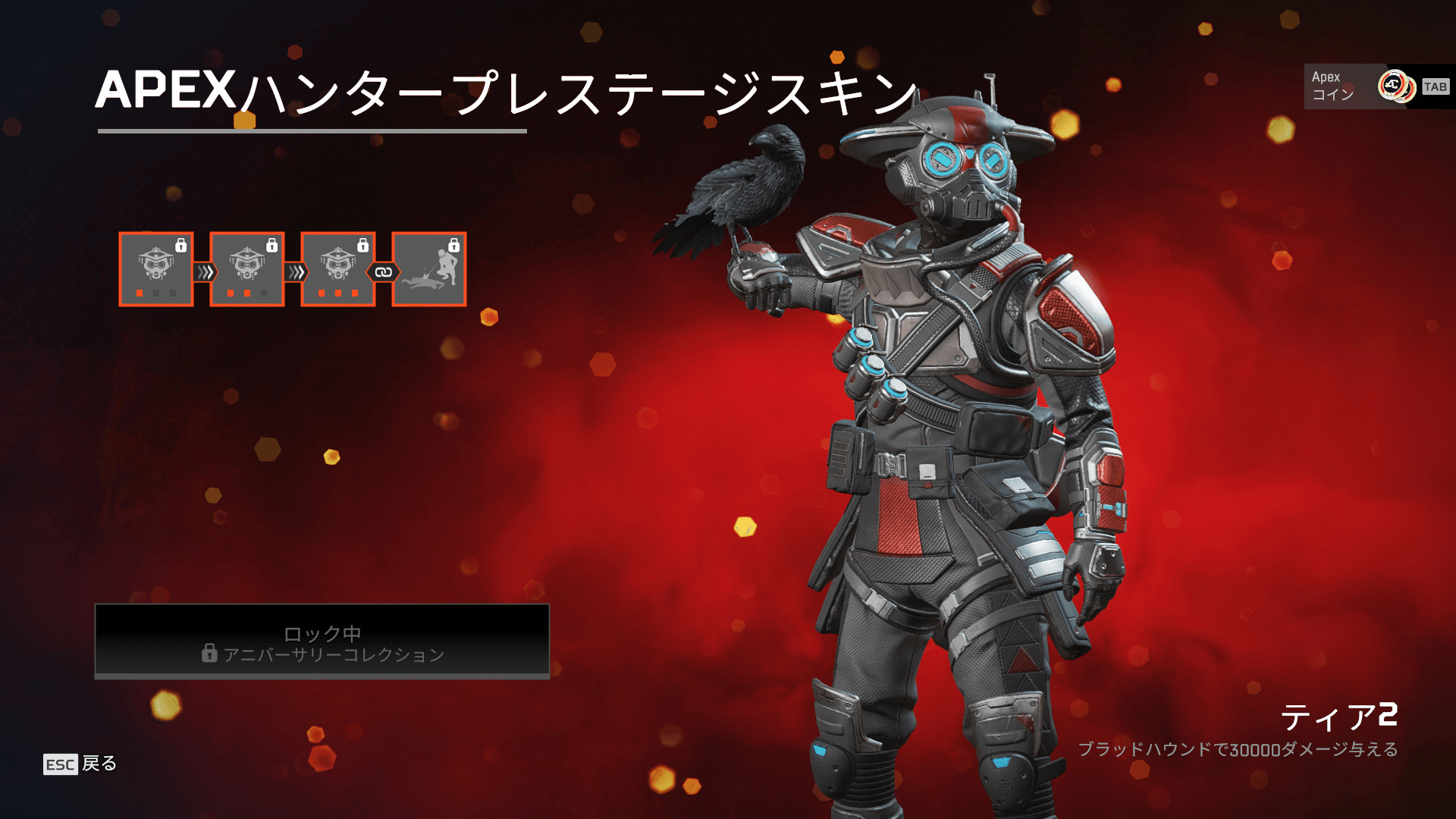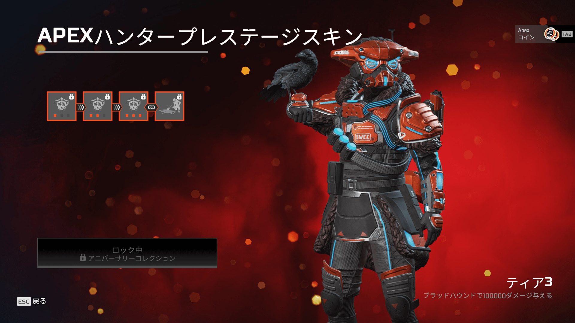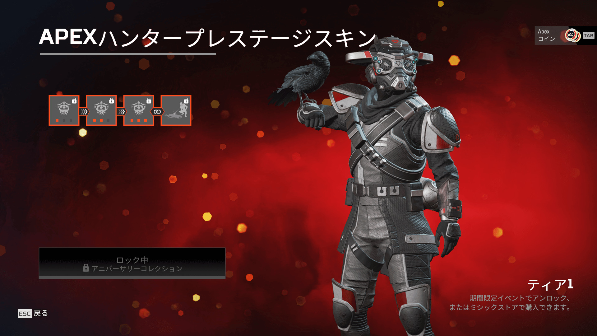 ※3周年アニバーサリーコレクションイベント終了後、ブラッドハウンドのプレステージスキンは、150スーパーレジェンドシャードを使ってミシックショップで入手可能になります。