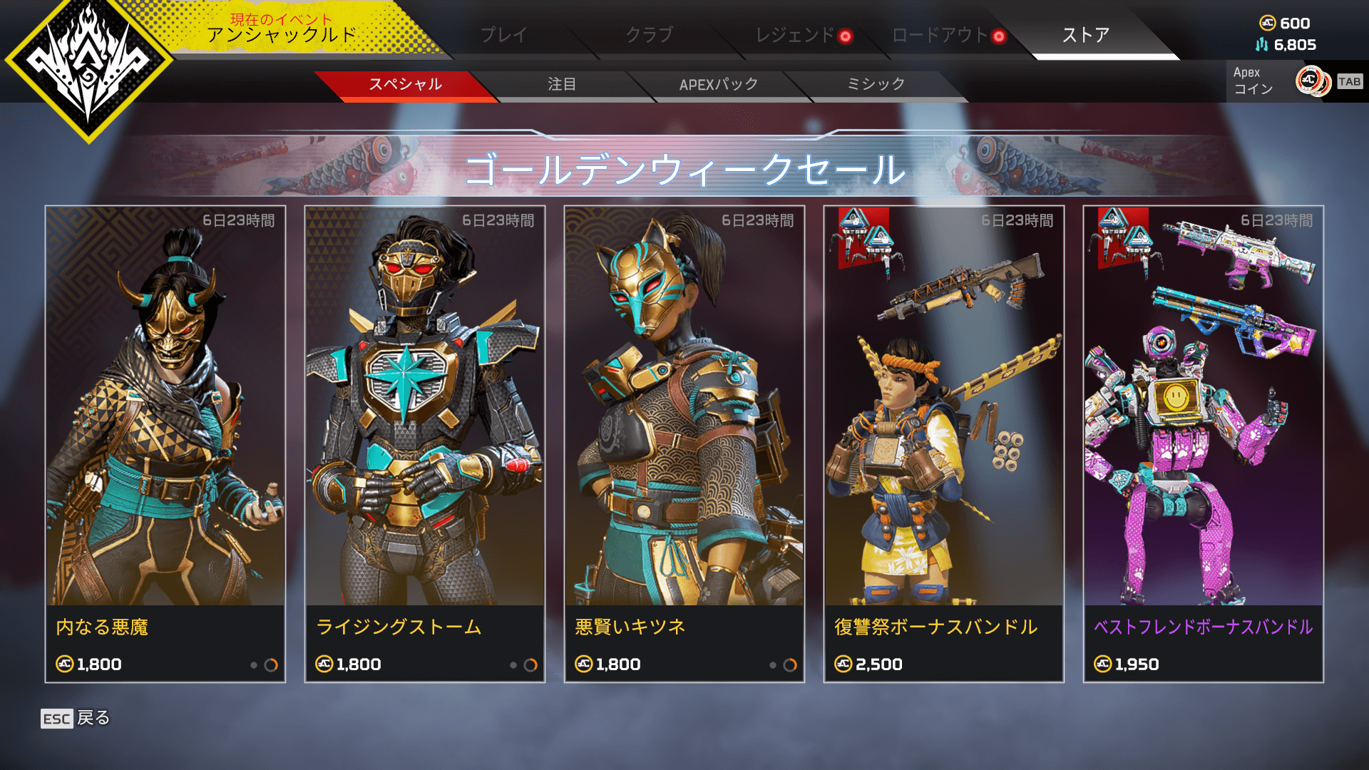 【APEXストア情報】「ゴールデンウィークセール」が1週間限定で開催!『レイス』『ホライゾン』『ランパート』のスキンが新登場