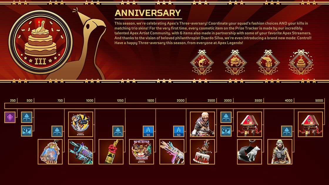 日本時間2月16日から3月2日まで続く3周年アニバーサリーコレクションイベントで「エーペックスレジェンズ」の3周年を祝おう。今回はこれまでとは違うコンテンツで、プレステージスキンやレジェンダリー部隊スキン、コミュニティーが作成した装飾アイテムの報酬トラッカーが登場します!詳しく見てみましょう。
