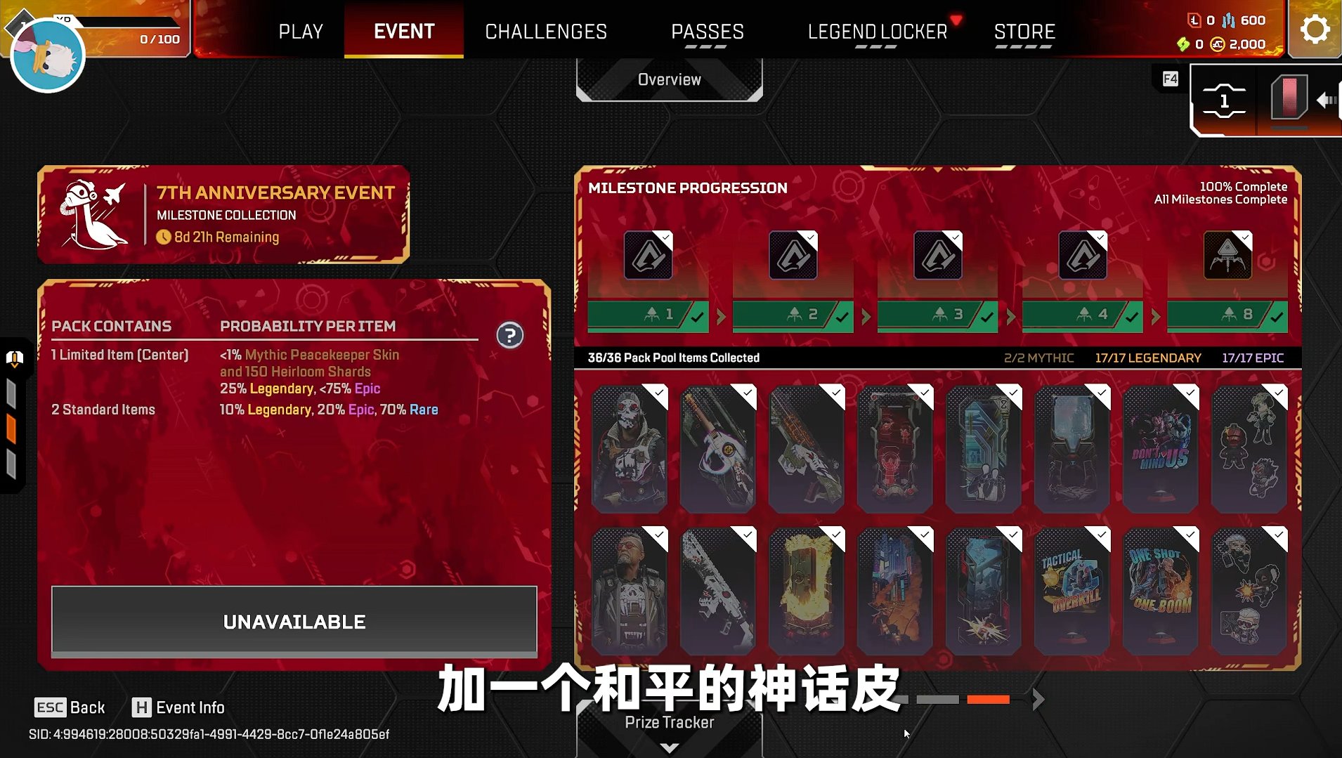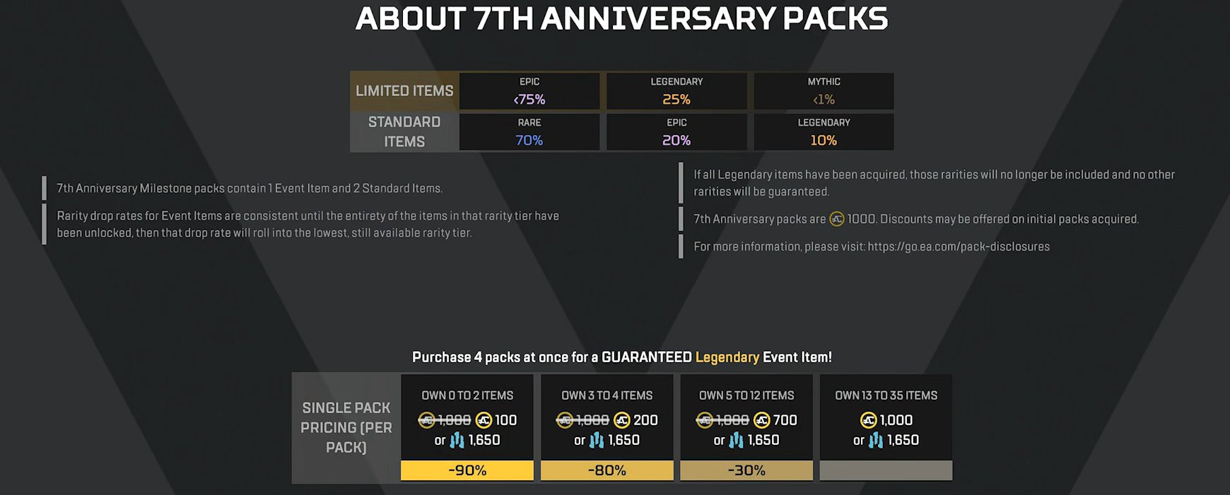 雑談【APEX】7周年記念イベントアイテム 2026年2月10日 2026年2月10日最新記事 【APEX】7周年記念イベントアイテム 【APEX】秋雪こはくさん&みらたんぐさん&Dokiさん&Natiコラボスキン実装!! 【APEX】シーズン28 ピースキーパーミシック(カラーバリエーション)&フレーム、チャーム、バッジなど 【APEX】シーズン28 ピースキーパーミシック、オルタネーター、ウイングマン、フラットライン、モザン、R301、RE45、EVA8各種スキン 【APEX】シーズン28バトルパス&7周年アニバーサリースキン 7周年記念イベントアイテム全36種のアイテムが実装。コンプには29,300コインが必要※フリートラッカー Facebook Twitter