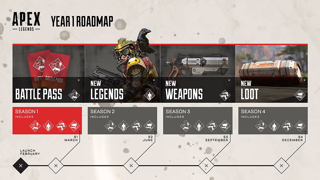エーペックス公式がシーズン1開始時に公開した1年の予定表を見ると、今までと同様にシーズン4でも「バトルバス」「新キャラクター」「新武器」が登場します。