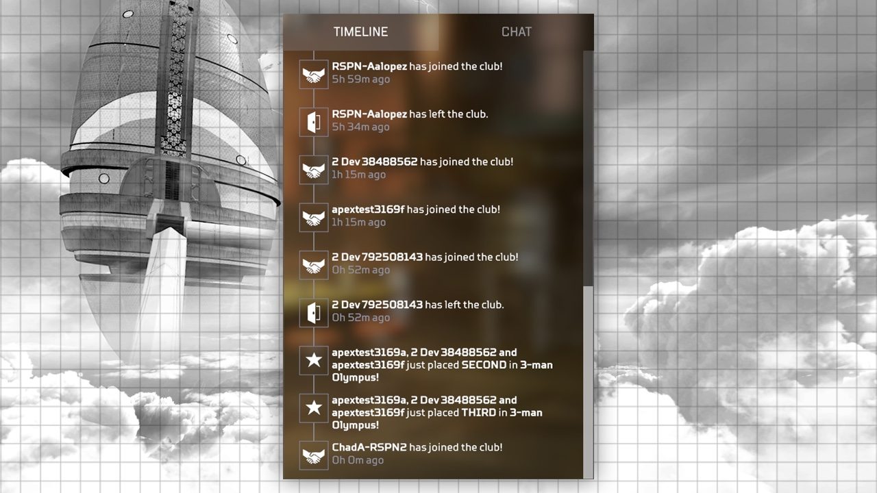 「タイムライン」のタブでは、新しい参加者や試合の上位5位以内に入るなど、クラブ内の最近のイベントを確認できます。