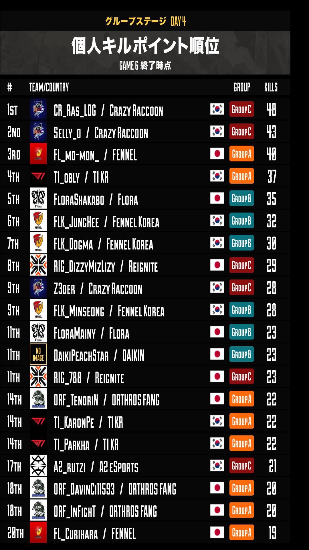 グループステージ最終日の個人キルポイントTOP5