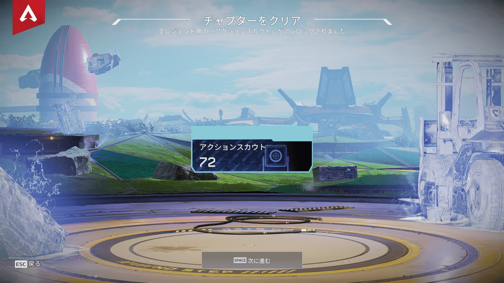 レジェンドをバンガロールに変更し、射撃訓練場の中央へ行くと「アクションスカウトチャレンジを始める」を押すことができます。