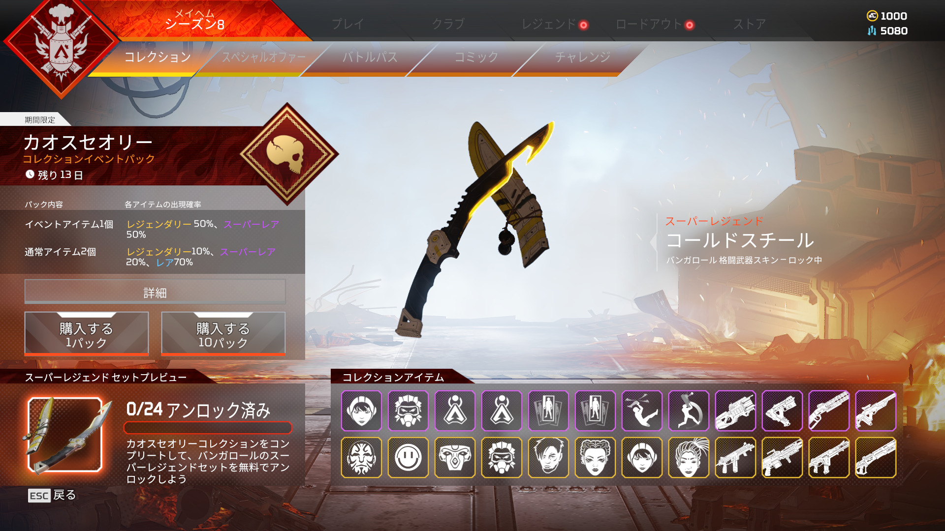最新情報【APEX】カオスセオリーコレクションイベントが開始!!限定アイテム情報まとめ 2021年3月10日 2021年3月10日最新記事 【APEX】緊急修正対応が行われました(サーバー側) 【APEX】レイスのエターナルライフスキンが11.26に再販 【APEX】シーズン27開始で アクティブユーザー20万人/DAY回復 【APEX】ヴァルキリー&ホライゾンが大幅上昇!前シーズン強化のシアが1%割れ(新シーズン27開始後のピックランク) 【APEX】シーズン27、世界大会、シーズン28のスケジュール 【APEX】カオスセオリーコレクションイベントが開始!!限定アイテム情報まとめスペシャルオファー画面 新アイテム コレクション画面 スーパーレアのコレクションアイテム レジェンダリーのコレクションアイテム コンプリート報酬 バンガロールのスーパーレジェンド 最新パッチノート内容はコチラ【速報】3月10日に配布される「シーズン8大型アプデ内容」日本語訳・まとめ【パッチノート】【速報】3月10日に配布された「シーズン8大型アプデ内容」日本語訳・まとめ【パッチノート】2021.3.5カオスセオリーコレクションイベント カオスセオリーコレクションイベントは日本時間3月10日から開始され、3月24日に終了します。 公式トレーラー Nintendo Switch版エーペックスのリリース 日本時間3月10日(水)、クロスプラットフォームプレイ、最新の期間限定コンテンツ、および他のバー... Facebook Twitter