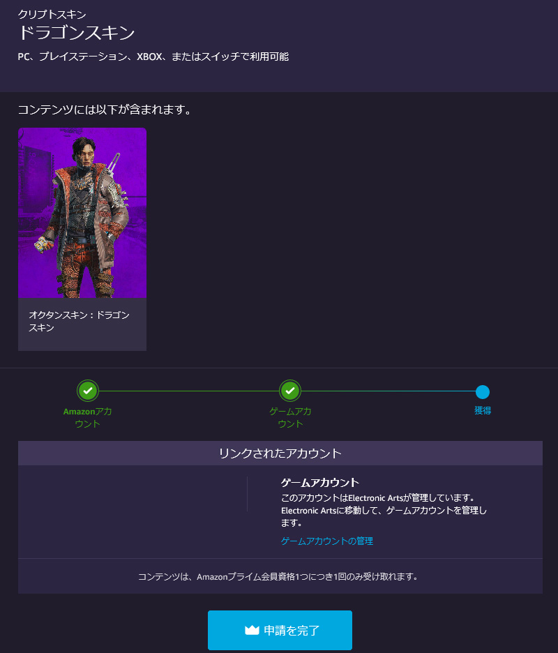 4. アカウントリンク後、欲しいスキン画像を押して「申請を完了」ボタンを押す