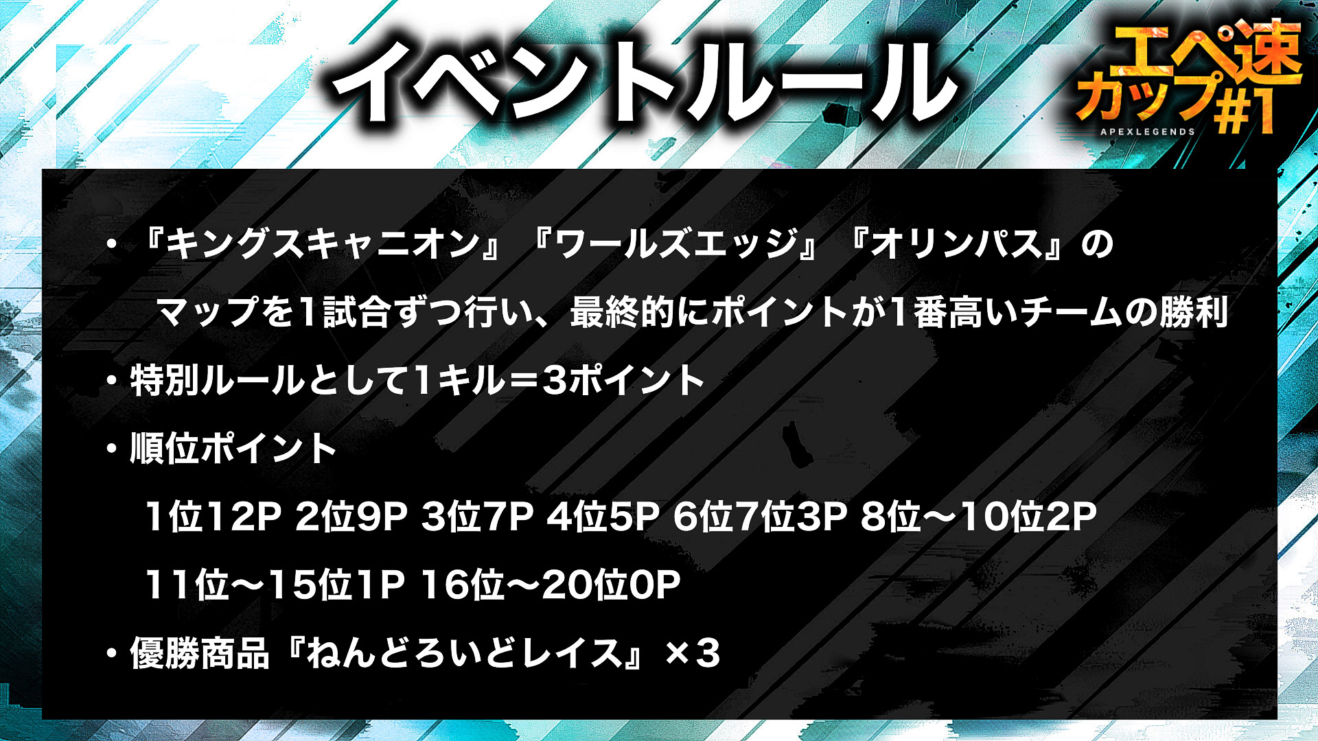 「キングスキャニオン」「ワールズエッジ」「オリンパス」の3マップを1試合ずつ行い、最終的に総合ポイントが一番高いチームの勝利。