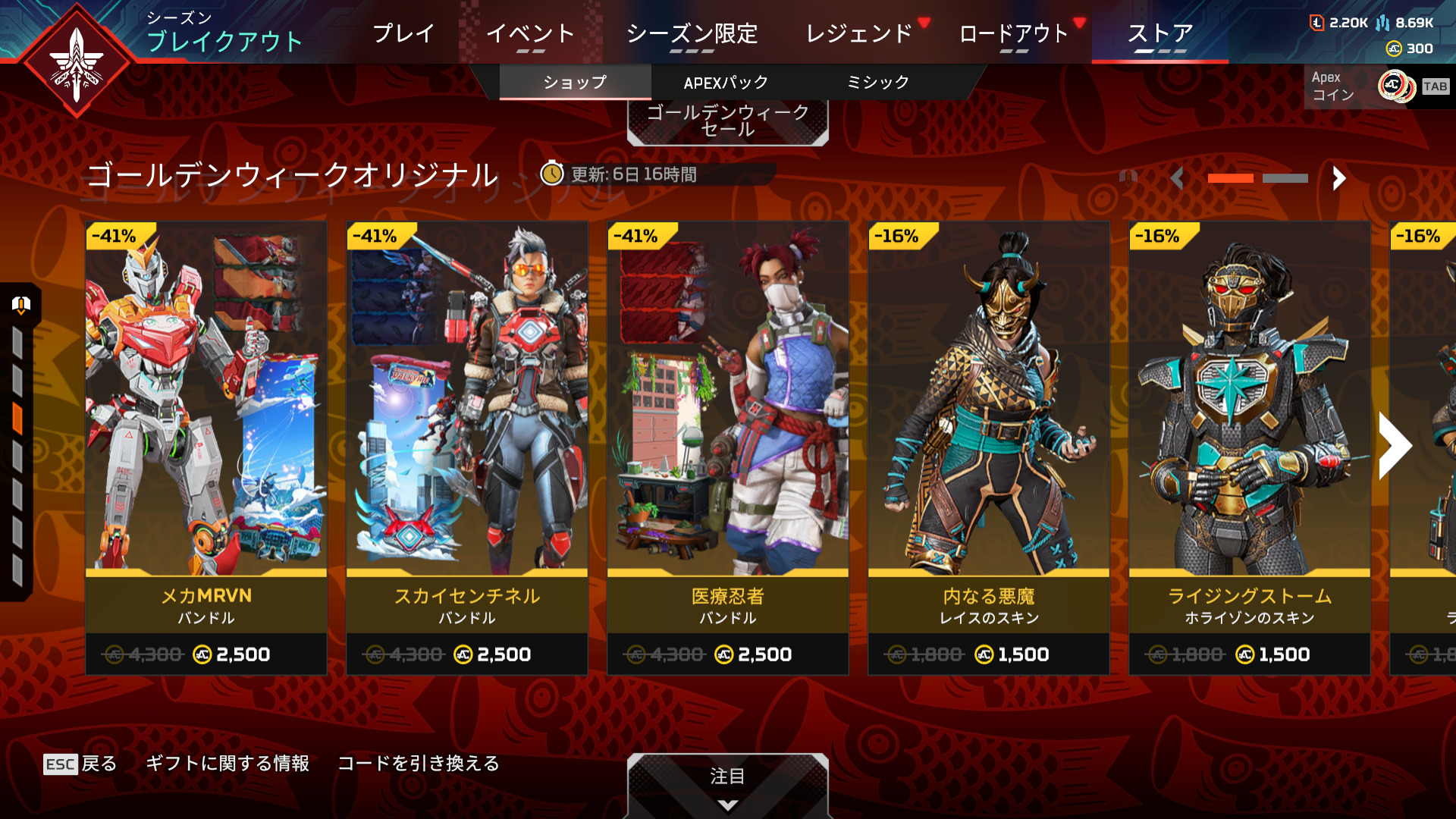 ストア情報【APEXストア情報】ゴールデンウィークセールが開催!「レヴナント」「コースティック」「バリスティック」の新規スキンが登場【画像あり】 2024年5月1日 2024年5月1日最新記事 【APEX】覚醒コレクションイベント/リカラー11.12ストア情報(リーク) 【APEX】緊急修正対応が行われました(サーバー側) 【APEX】レイスのエターナルライフスキンが11.26に再販 【APEX】シーズン27開始で アクティブユーザー20万人/DAY回復 【APEX】ヴァルキリー&ホライゾンが大幅上昇!前シーズン強化のシアが1%割れ(新シーズン27開始後のピックランク) 【APEXストア情報】ゴールデンウィークセールが開催!「レヴナント」「コースティック」「バリスティック」の新規スキンが登場【画像あり】ストア画面新スキンの詳細レヴナント「ヴァイオレット・デライト」コースティック「残忍な根絶者」バリスティック「復讐の血統」エペ速管理人亀仙人スキンめちゃくちゃ強そう最新記事【APEXシーズン21】5月2日に新キャラ「Alter」のストーリー動画が公開されるぞ!!最新情報【APEXシーズン21】5月2日に新キャラ「Alter」のストーリー動画が公開されるぞ!!【APEXシーズン21】5月2日に新キャラ「Alter」のストーリー動画が公開されるぞ!! Alter | Based on a True Story 日本時間5月2日 0:00より次の新レジェンド「Alter」のストーリー動画が公式YouTubeチャンネルより公開されます。 エペ速管理人 きたああ... Facebook Twitter