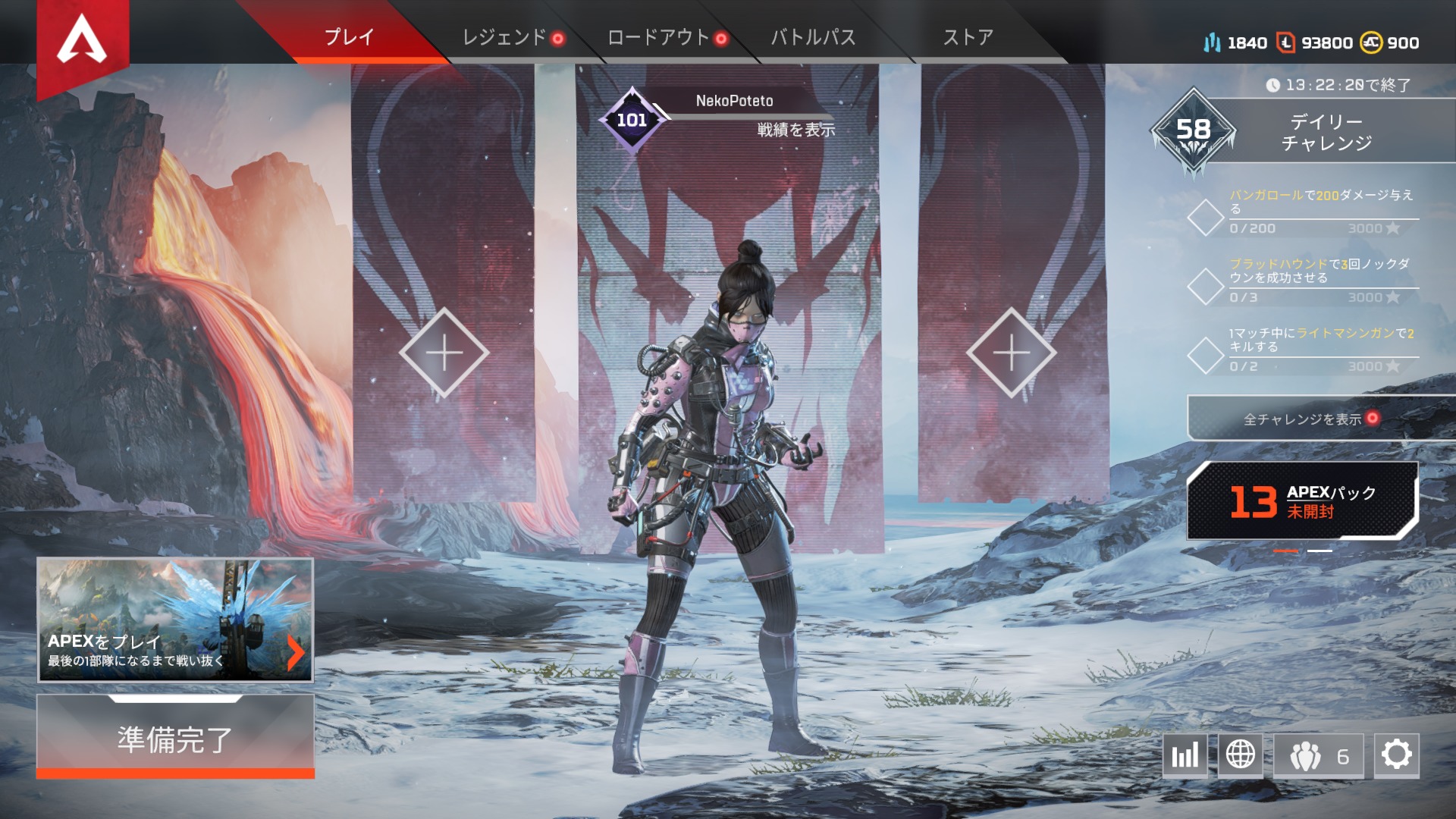 メインメニューにはレベル101の自分とレベル上限の開放に伴うパック報酬の獲得(14Apexパック)、更には新たな武器チャームの追加が確認できました。