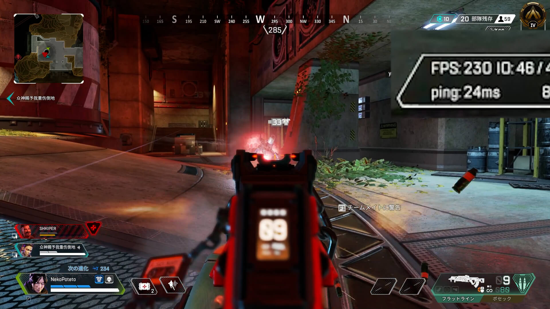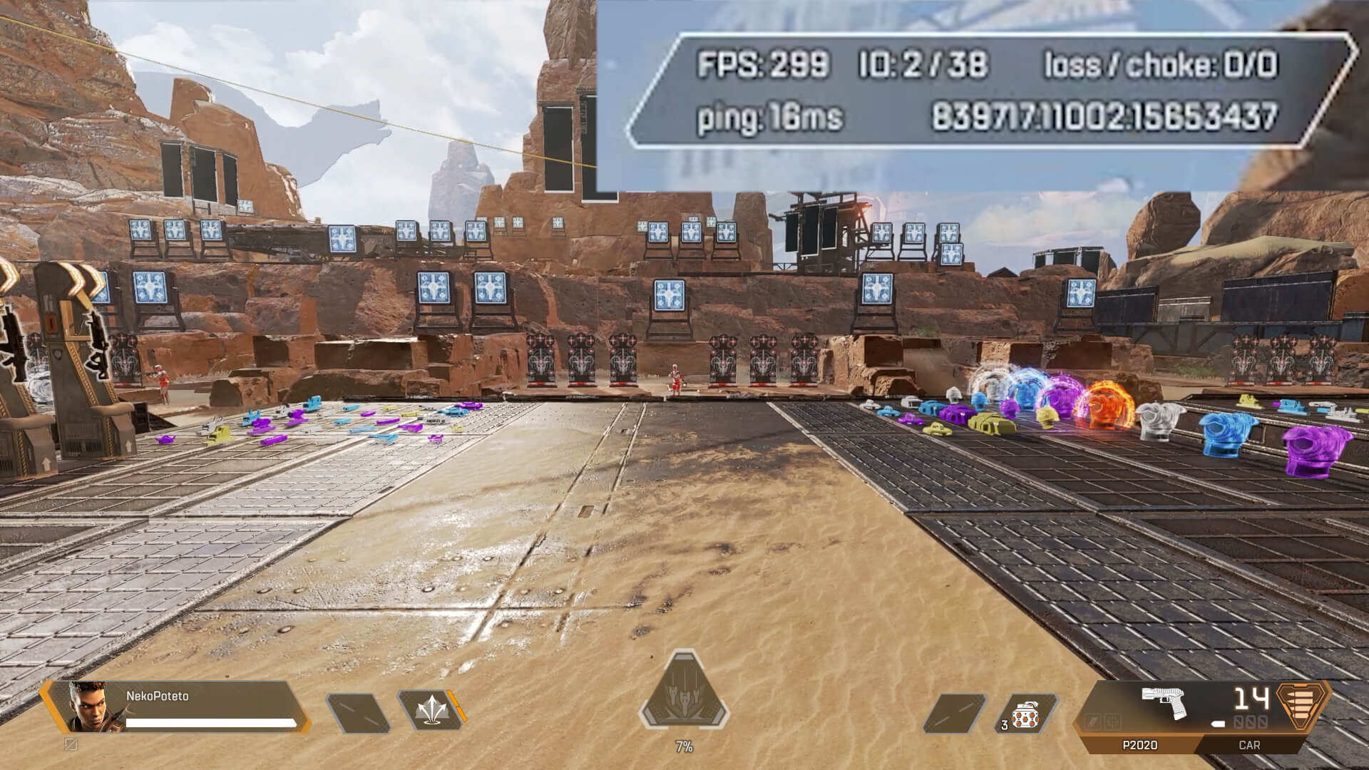武器が並んでいるエリアで棒立ちをしてみたところ、299FPS(エーペックスの上限FPS値)で張り付きました。
