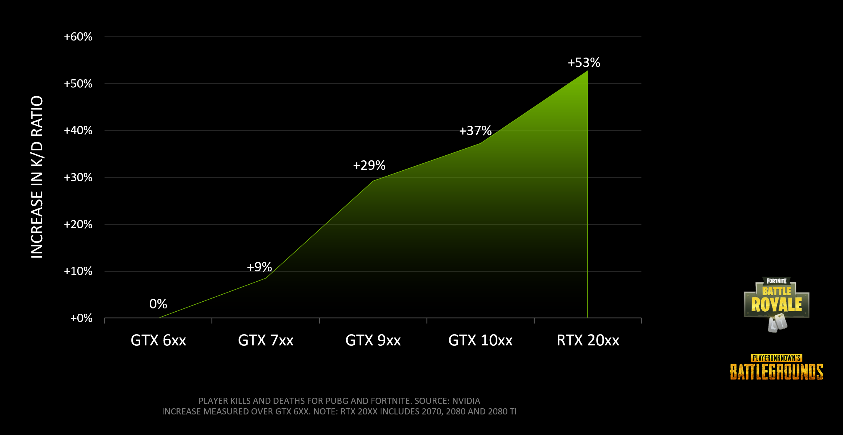 上のチャートが示しているように、新しいGeForce RTX 20グラフィックスカードを使用している中級プレイヤーは、前の世代であるGTX 600シリーズのカードを使用しているプレイヤーよりK/D比が53%高くなっています。