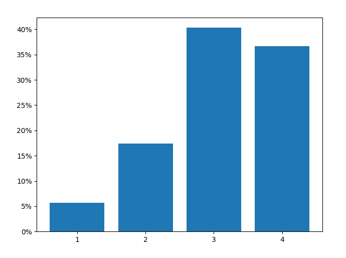 X軸: グループ番号(1が最低スキル、4が最高スキル)、Y軸: そのグループに含まれるマッチ数の割合