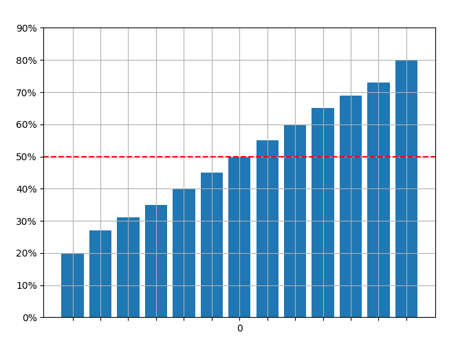 - アドバンテージが0より小さい(プロット上では0の左)場合、その部隊のスキルが相手より低いことを意味し、当然ながら勝率は50%を下回ることが分かります。勝率は、スキルの差が大きくなるにつれてさらに減少します。