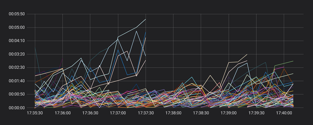 各色の線は、あるスキルグループ内での現在の最大待ち時間を時系列で表したものです。17:37:30あたりから、高スキルグループが公平なマッチを見つけるために、より長く待たなければならなかったことがわかります。新マッチメイキングシステムは、待ち時間やマッチングのスキル差のバランスを自動的に調整します。