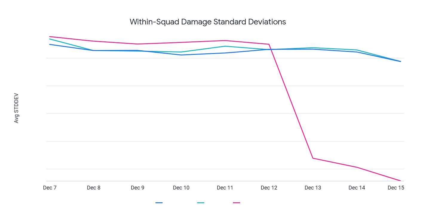 マゼンタの線は新しいマッチメイキングを利用した地域、青の線は対照群として機能する2つの地域です。このマッチメイキングが稼動すると、チーム内の平均的なパフォーマンス差が大きく減少したことがわかると思います。つまり、チームメイトがより平等にパフォーマンスを発揮できるようになり、この新しいマッチメイキングシステムでは一人のプレイヤーが重荷を背負う必要性が低くなっています。