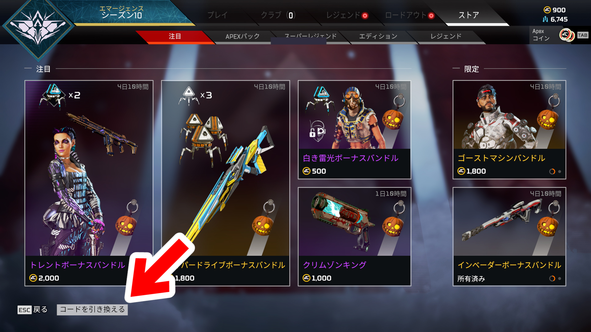 引き換えコードはエーペックスのゲーム内の「ストアタブ左下」から入力することができます。