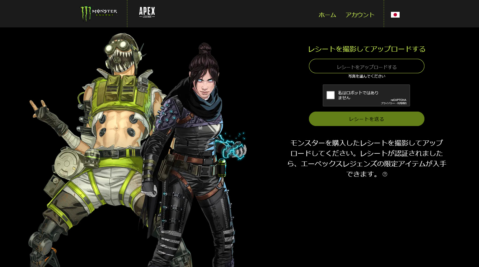 アカウント作成後、ホーム画面でモンスターエナジーを購入した「レシート画像」をアップロードする。