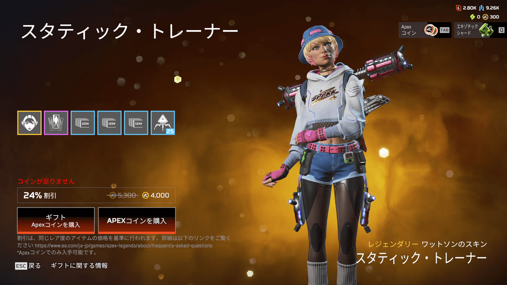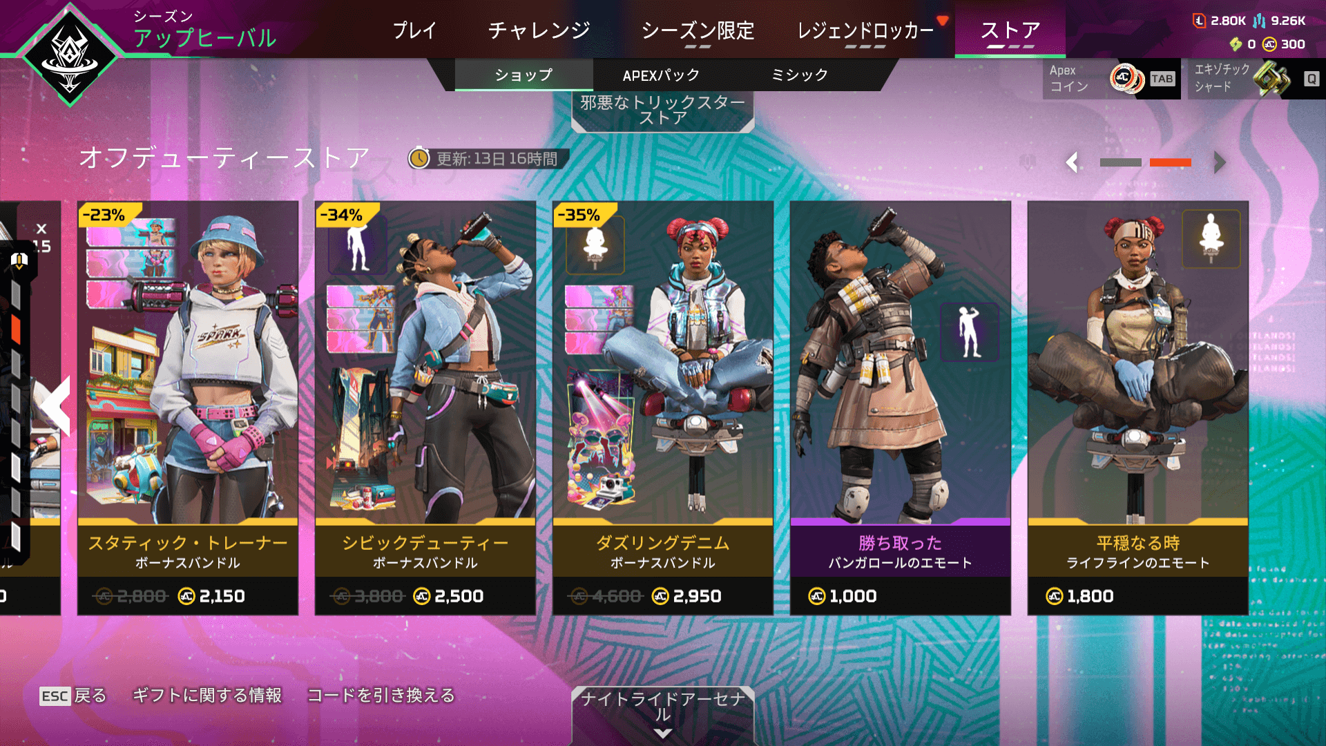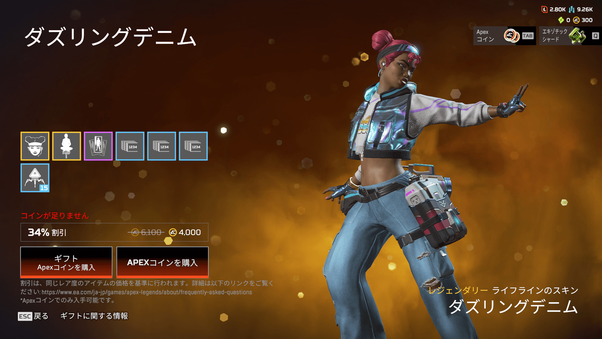 ストア情報【APEXストア情報】オフデューティーストアが開催!「ワットソン」「バンガロール」「ライフライン」の新スキンと新トラッカーが登場【画像あり】 2024年5月29日 2024年5月29日最新記事 【APEX】10.29ストア情報!リカラー更新! 【APEX】シーズン27「Amped」のゲームプレイトレーラーが10月31日AM0時に公開!爽快でスピーディなプレイが! EA「社内AIツールのせいで開発現場が混乱中」従業員が証言。 【APEX】ウインターイベント(シーズン27)のスキン情報 【APEX】札幌はどうしよう?と悩んでいる、そこのあなた!迷ったらGO!7つのおすすめポイント 【APEXストア情報】オフデューティーストアが開催!「ワットソン」「バンガロール」「ライフライン」の新スキンと新トラッカーが登場【画像あり】ストア画面オフデューティーストア他のストア情報新スキンの詳細ワットソン「スタティック・トレーナー」バンガロール「シビックデューティー」ライフライン「ダズリングデニム」最新記事【APEXシーズン21】現在のレジェンドピック率ランキング→「パスファインダー」と「ライフライン」が上位に最新情報【APEXシーズン21】現在のレジェンドピック率ランキング→「パスファインダー」と「ライフライン」が上位に【APEXシーズン21】現在のレジェンドピック率ランキング→「パスファインダー」と「ライフライン」が上位に 第1位: パスファインダー(9.4%) 第2位: ライフライン(8.7%) 第3位: オクタン(8.3%) 第6位: オルター(6.8%) 4位から26位まで 第4位: ブラッドハウンド(7.... Facebook Twitter
