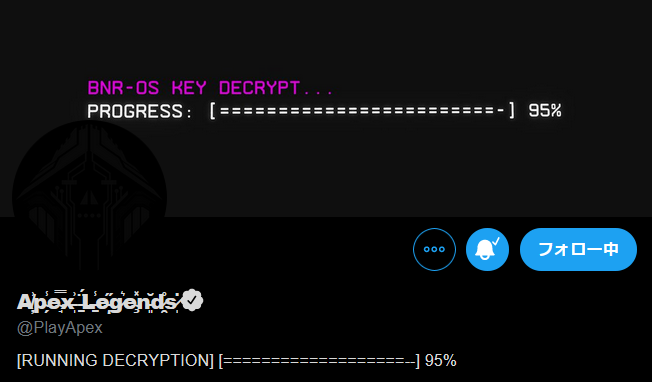 雑談エーペックスレジェンズ公式Twitterが意味深な動画をツイート!? 2019年9月27日 2019年9月27日最新記事 【APEX】覚醒コレクションイベント/リカラー11.12ストア情報(リーク) 【APEX】緊急修正対応が行われました(サーバー側) 【APEX】レイスのエターナルライフスキンが11.26に再販 【APEX】シーズン27開始で アクティブユーザー20万人/DAY回復 【APEX】ヴァルキリー&ホライゾンが大幅上昇!前シーズン強化のシアが1%割れ(新シーズン27開始後のピックランク) Twitter/@PlayApexよりhttps://apexlegends-news.com/wp-content/uploads/2019/09/ACCESSING-FILE-NEW-DAWN-UPLOADING-TO-DATABASE-ESTIMATED-TIME....1440-MINUTES-.mp4エペ速管理人なんだろうコレ!?PVE!?おまけ遂にApex公式ツイッターのゲージが95%に過去の意味深ツイートまとめ記事エーペックスレジェンズ公式Twitterがクリプトにハッキングされている!?2019.9.26Twitter/@playapexさんより クリプトのトレーラーを公開してから... Do̴͕̽ yoȗ̸̠ feel that ạ̷͠drenaḽ̵̕ine surgì̶͔ng̷͎̏ thr̶̤͊ough your veiṉ̶̈́s? No̷̠̔? j̴̹̕ust me? W̶̨̚hiplaš̴̥... Facebook Twitter