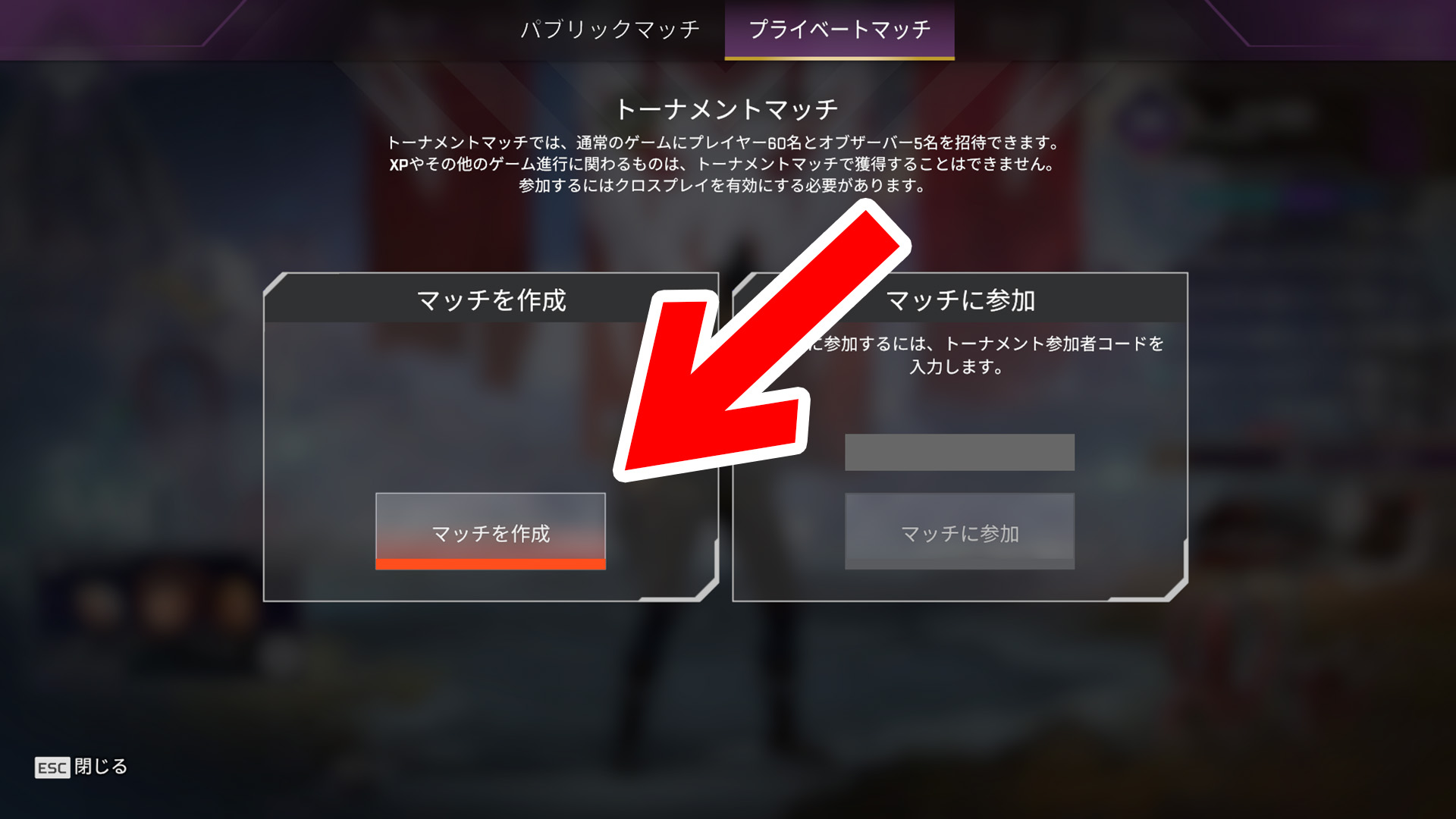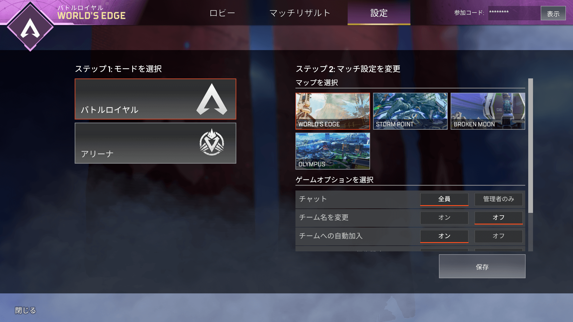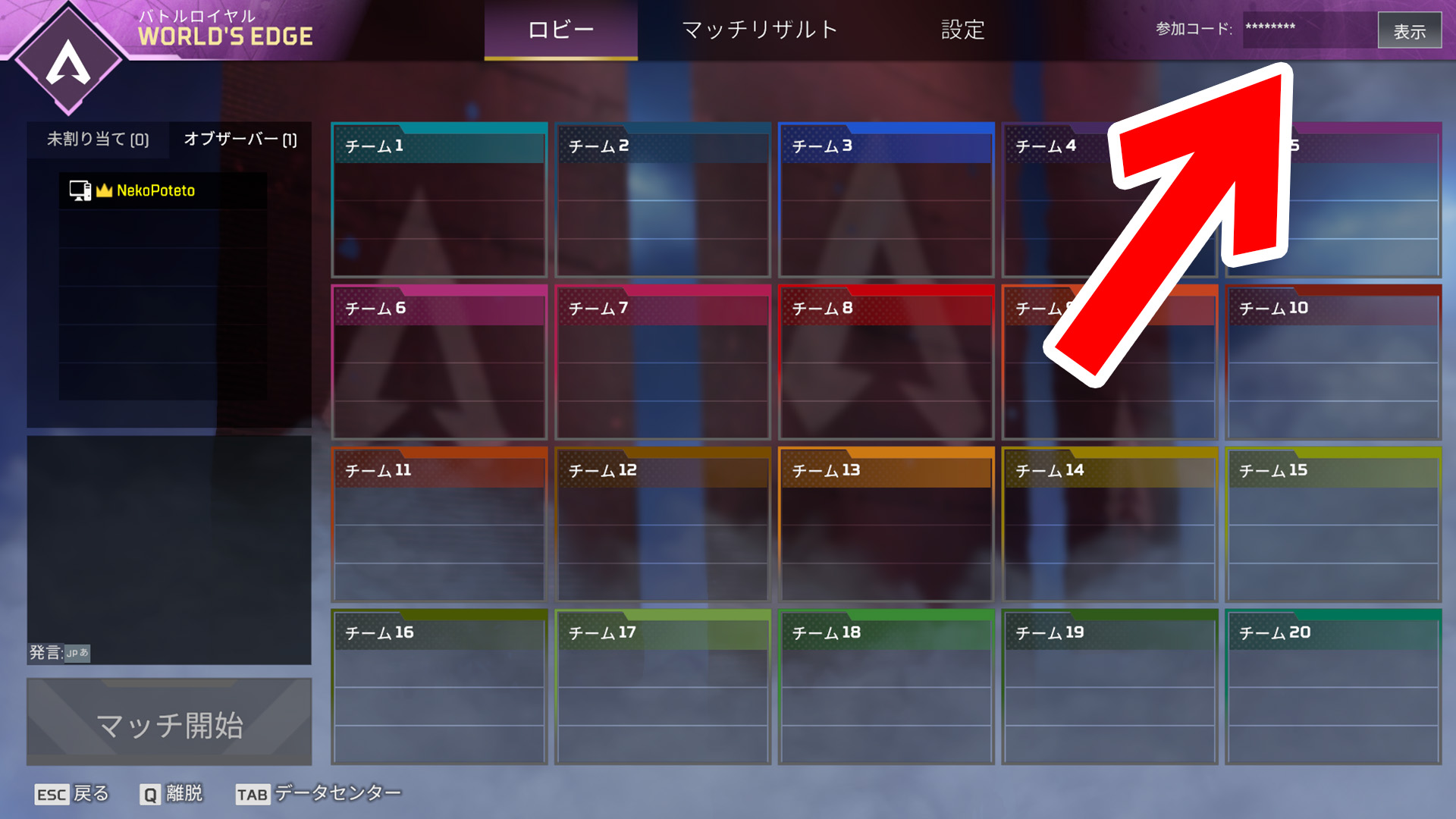 「プライベートマッチタブ」から参加コードを入力する。
