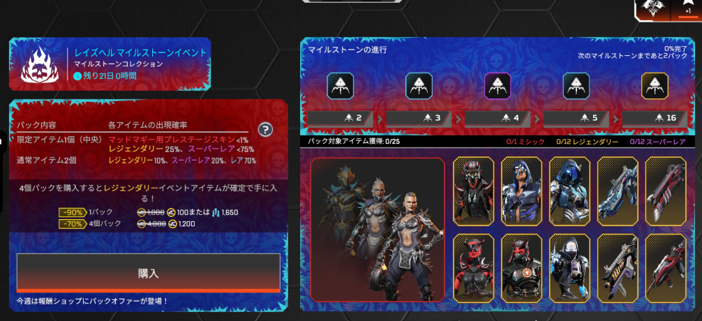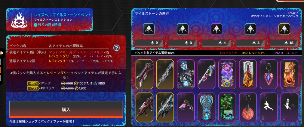 ストア情報【APEX】レイズヘルイベント、報酬、セレクトパック、リカラー 10.15ストア更新!! 2025年10月15日 2025年10月15日最新記事 【APEX】シーズン27パッチノート公開!! 【APEX】APEX LEGENDS™ つまんでつなげてますこっと 11月2週から! 【APEX】R-99ミシック図鑑 【APEX】シーズン27に強化されるレジェンズのパーク画面 【APEX】バンガ、ライフライン、ワット、レイスの新スキントラッカー レイズヘルイベント、報酬、セレクトパック、リカラー 10.15ストア更新!!◆レイズヘルマイルストンイベント◆レイズヘルマイルストーンコレクション◆報酬ショップ◆セレクトパックストア◆リカラー Facebook Twitter