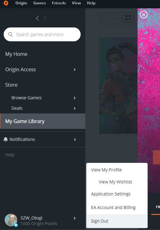 Originアプリの左下にある自分のプロフィールから「EAアカウントと請求」を押す。