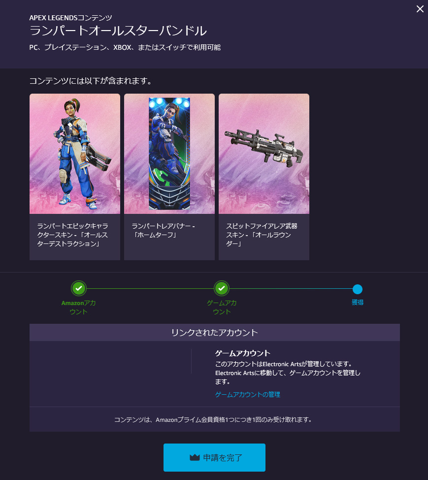 3. Twitch Prime Gamingのゲーム一覧から「エーペックスレジェンズ」のページに行き、現在配布されているアイテムを選択。その後『EAアカウントとAmazonアカウントのリンク(紐付け設定)』を行う。