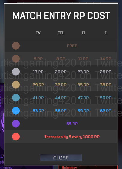 データマイナーAG420さんにより、ランクマッチのエントリーコストがプレデター以外の全ランク帯で10RP下がっている画像がリークされました。