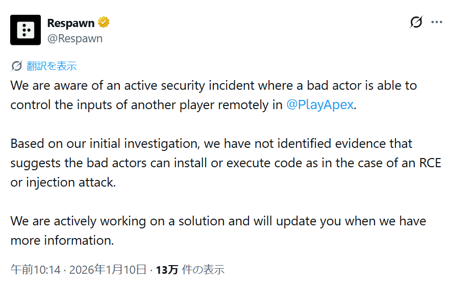 APEX開発のRespawnは公式Xで現在、調査中と発表
