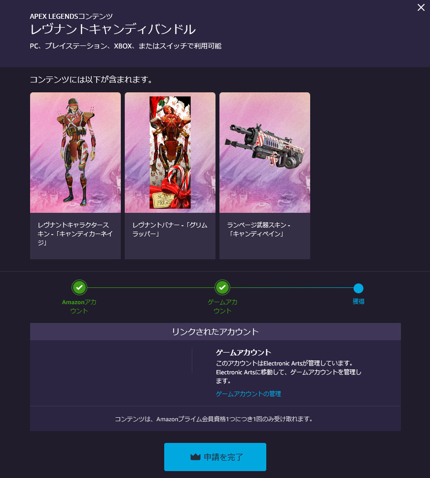 3. Twitch Prime Gamingのゲーム一覧から「エーペックスレジェンズ」のページに行き、現在配布されているアイテムを選択。その後『EAアカウントとAmazonアカウントのリンク(紐付け設定)』を行う。