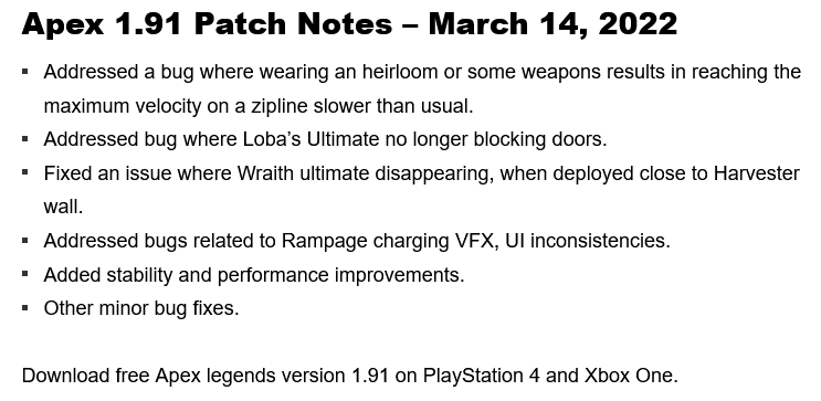 ・スーパーレジェンドや武器を装備していると、通常よりも遅いジップライン(恐らくグラップリングのこと)で最大速度に到達するバグを修正しました