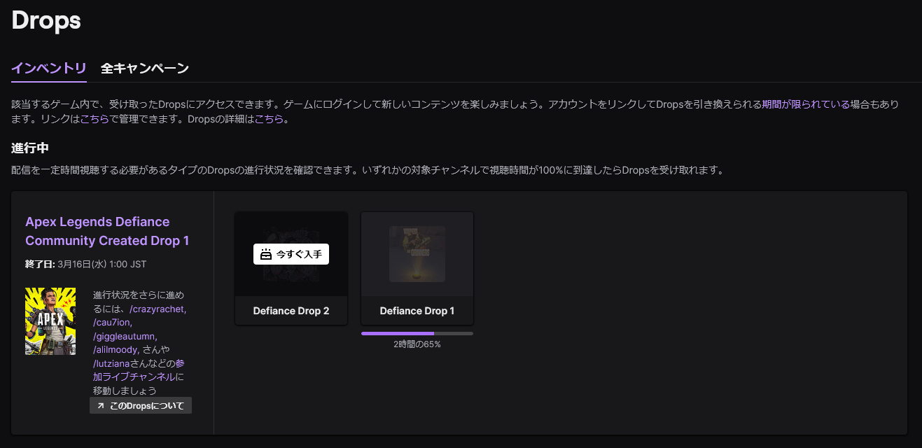 TwitchのDropメニューから進捗状況の確認やアイテムの受け取りが可能です。