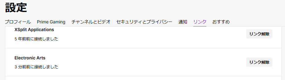 3. Twitchの設定→リンクの部分で「Electronic Arts」と接続できていることが確認できればアイテムが獲得可能な状態になります。
