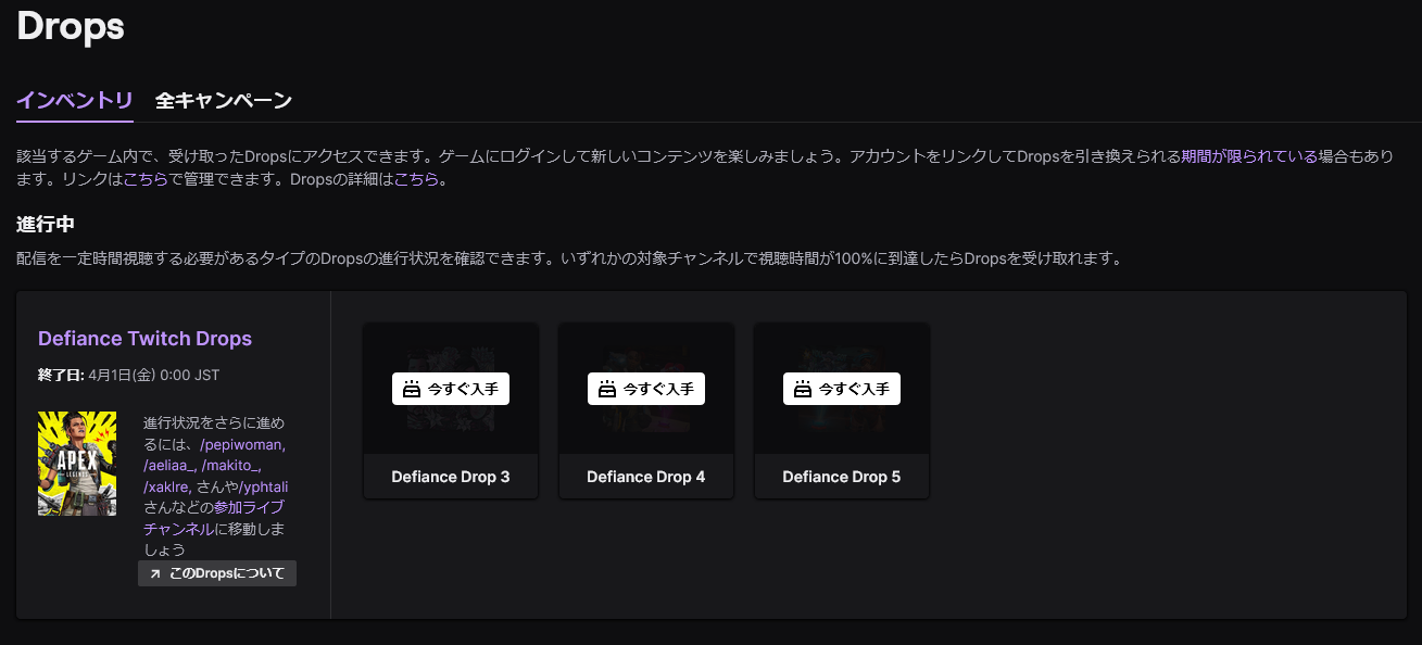 TwitchのDropメニューから進捗状況の確認やアイテムの受け取りが可能です。
