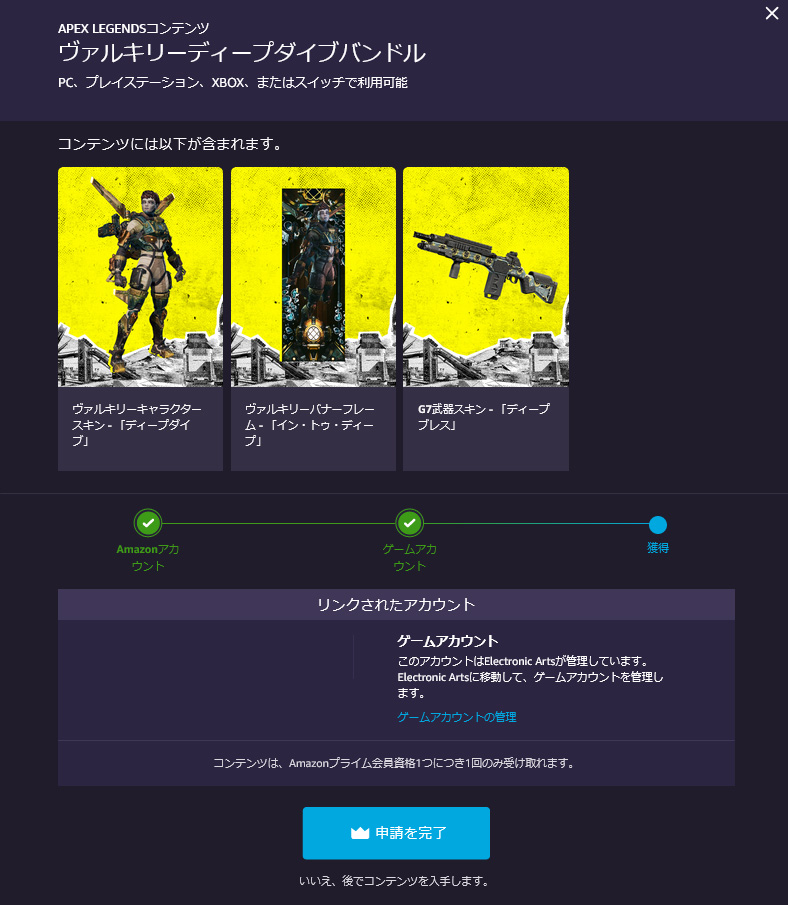 3. Twitch Primeのゲーム一覧から「エーペックスレジェンズ」のページに行き、現在配布されているスキンを押す。そして『EAアカウントとAmazonアカウントのリンク(紐付け設定)』を行う。