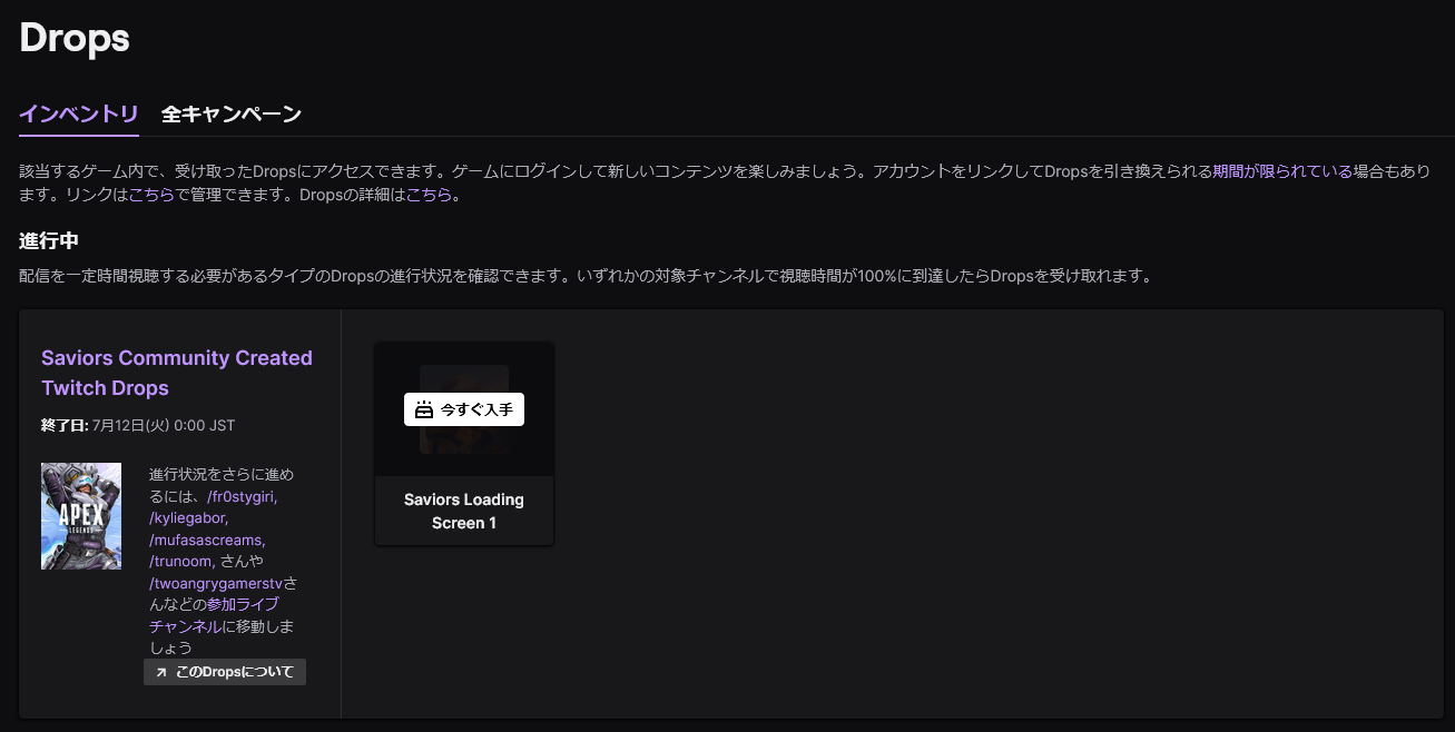 TwitchのDropメニューから「進捗状況の確認」や「アイテムの受け取り」が可能です。