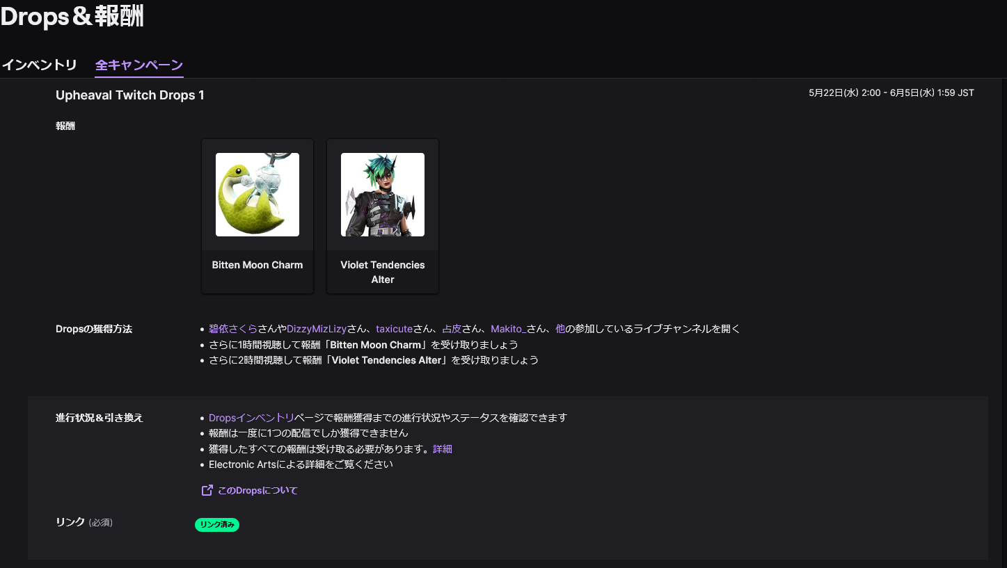 対象の配信者はコチラから: https://www.twitch.tv/drops/campaigns