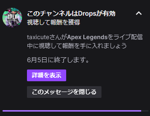 配信者がTwitch Dropsを有効化にしている場合はこのようなポップアップが現れます(PC視聴)