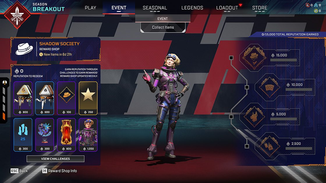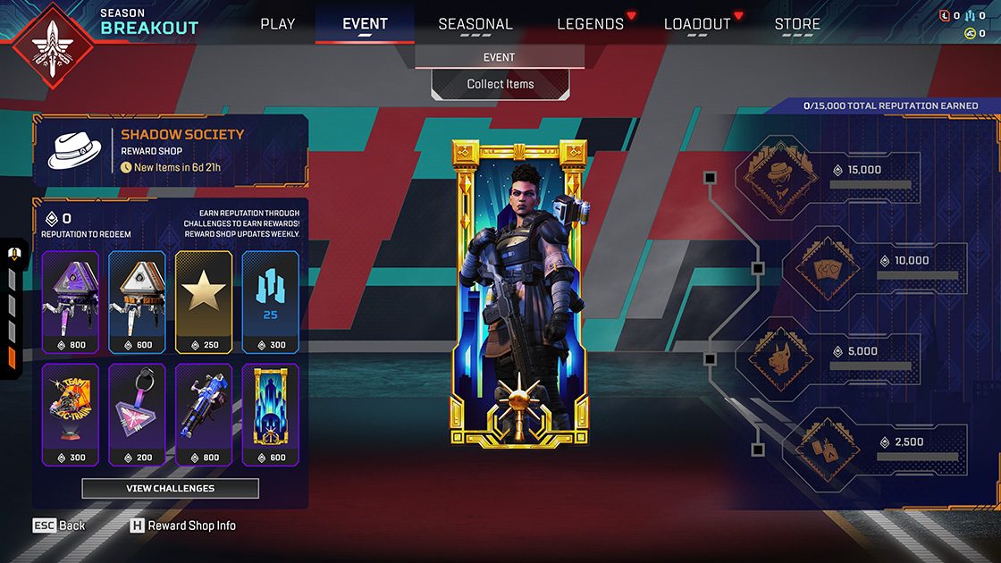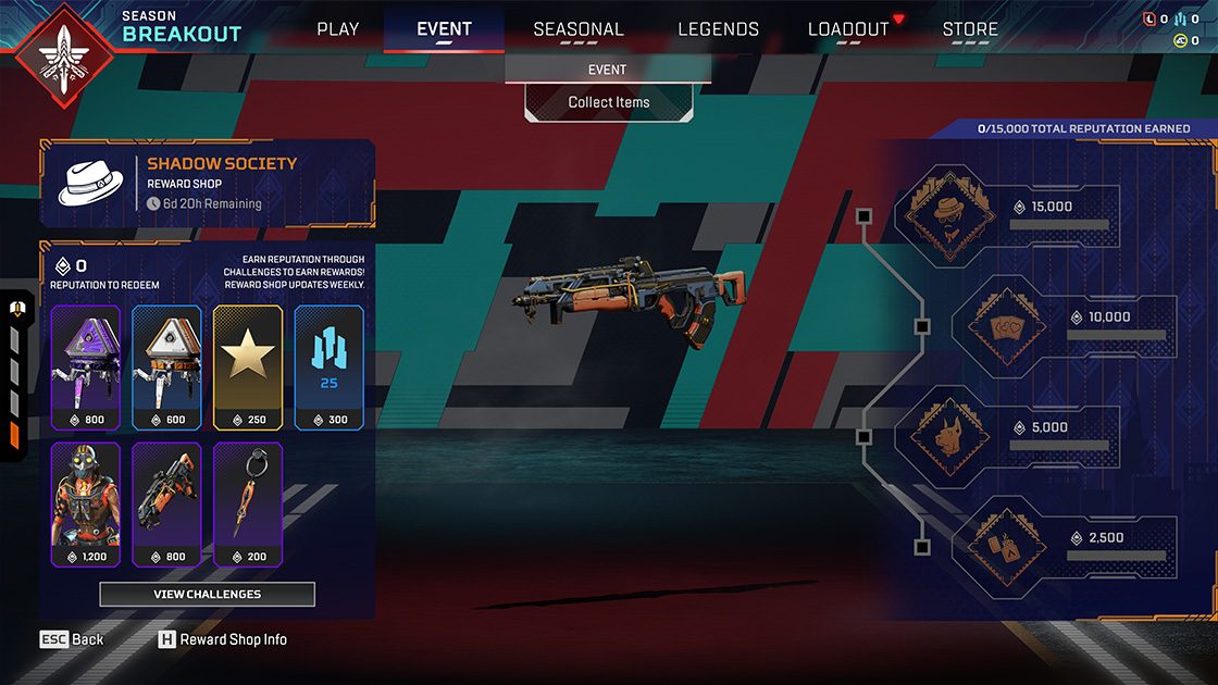マッドマギーやホライゾンのレジェンダリースキンを含む、カットスロートをテーマにした36種類の期間限定装飾アイテムを発見しよう!イベント中に獲得したシャドウ・ソサエティのアイテムは、マイルストーン報酬にもカウントされます。このボーナス報酬は、コレクションを進めていくことで入手します。マイルストーン報酬は、5種、10種、20種、および全36種のアイテムをアンロックすると自動的に獲得できます。