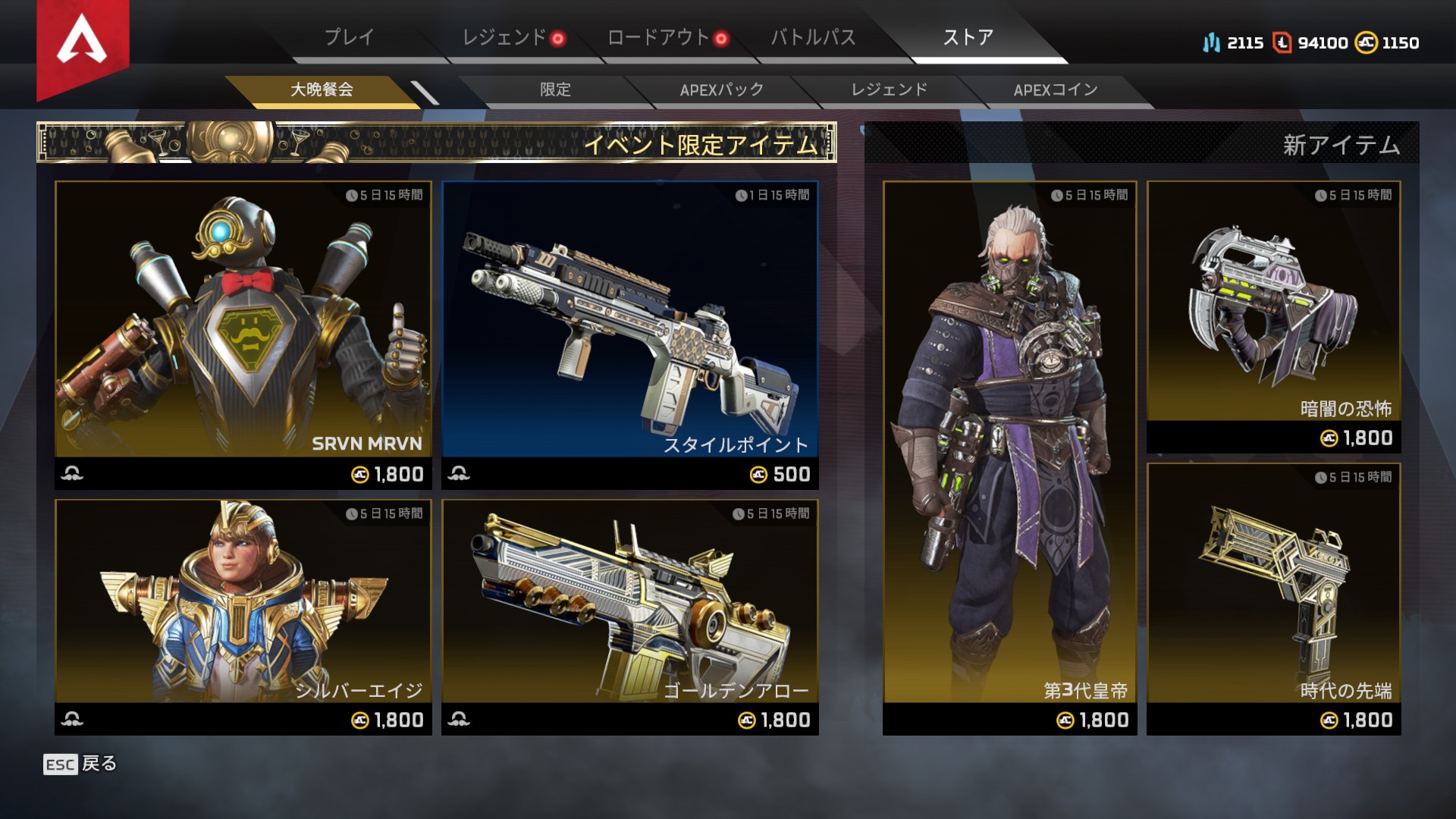 ※一番左のスキンはミラージュのレジェンダリースキンです。(何度再起動してもスキンが読み込めなかった)