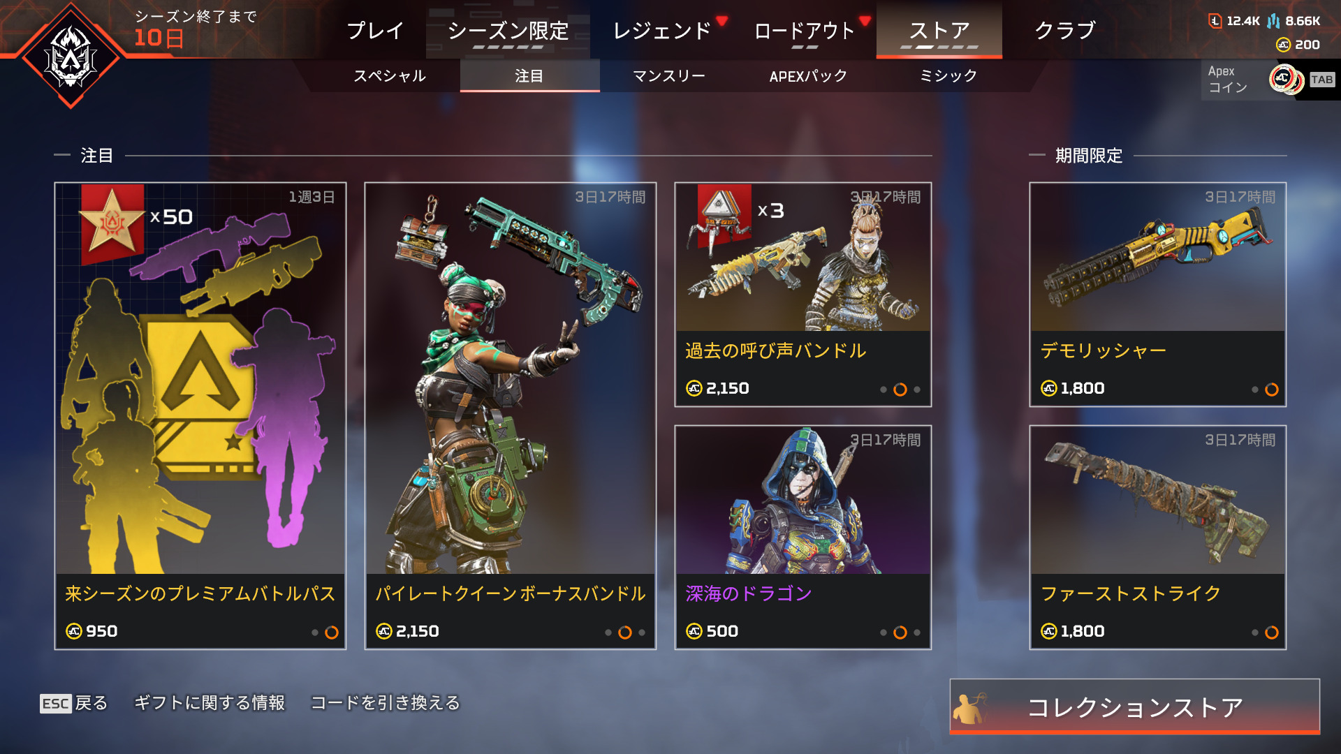 ストア情報【通常ストア情報】ピースキーパーとトリプルテイクの色違いレジェンダリースキンが登場 2023年10月21日 2023年10月21日最新記事 【APEX】10.29ストア情報!リカラー更新! 【APEX】シーズン27「Amped」のゲームプレイトレーラーが10月31日AM0時に公開!爽快でスピーディなプレイが! EA「社内AIツールのせいで開発現場が混乱中」従業員が証言。 【APEX】ウインターイベント(シーズン27)のスキン情報 【APEX】札幌はどうしよう?と悩んでいる、そこのあなた!迷ったらGO!7つのおすすめポイント 【通常ストア情報】ピースキーパーとトリプルテイクの色違いレジェンダリースキンが登場ストア画面ストア内容の詳細新しく追加されたアイテムのみ紹介しています。ピースキーパーのスキン「デモリッシャー」ピースキーパーの色違いスキン「隠れんぼ」トリプルテイクのスキン「ファーストストライク」トリプルテイクの色違いスキン「シーストーカー」 Facebook Twitter