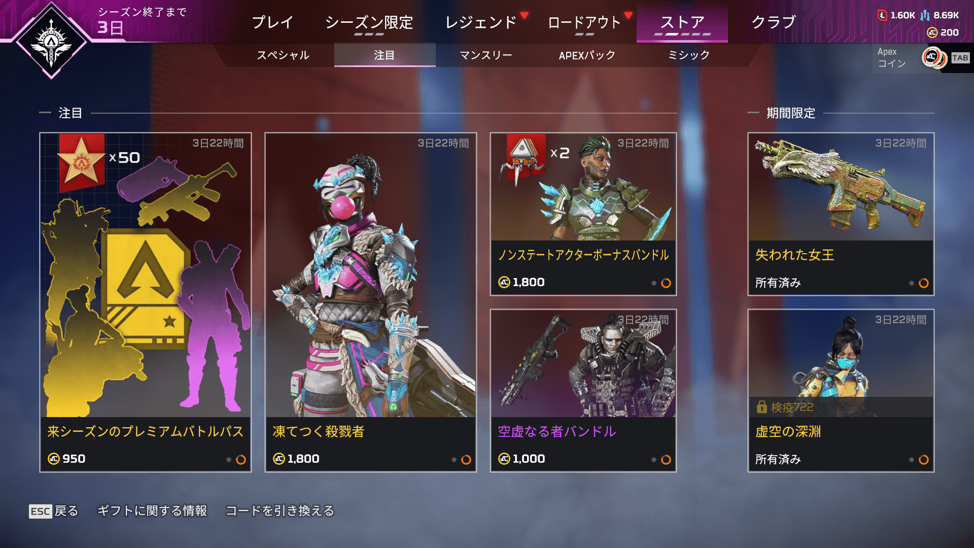 ストア情報【通常ストア情報】「レイス」「ヘムロック」の色違いスキンが登場!! 2024年2月10日 2024年2月10日最新記事 【APEX】10.29ストア情報!リカラー更新! 【APEX】シーズン27「Amped」のゲームプレイトレーラーが10月31日AM0時に公開!爽快でスピーディなプレイが! EA「社内AIツールのせいで開発現場が混乱中」従業員が証言。 【APEX】ウインターイベント(シーズン27)のスキン情報 【APEX】札幌はどうしよう?と悩んでいる、そこのあなた!迷ったらGO!7つのおすすめポイント 【通常ストア情報】「レイス」「ヘムロック」の色違いスキンが登場!!ストア画面ストア内容の詳細新しく追加されたアイテムのみ紹介しています。レイスのスキン「検疫722」レイスの色違いスキン「虚空の深淵」ヘムロックのスキン「失われた女王」ヘムロックの色違いスキン「忘れられた漂浪」最新記事【APEXシーズン20】祝5周年!「アニバーサリーコレクションイベント」の内容まとめ・新期間限定モードなど最新情報【APEXシーズン20】祝5周年!「アニバーサリーコレクションイベント」の内容まとめ・新期間限定モードなど【APEXシーズン20】祝5周年!「アニバーサリーコレクションイベント」の内容まとめ・新期間限定モードなど レジェンドの皆さん、5周年を祝福しましょう! とってもエキサイティングなものをたくさんご用意しています。アクション満載の新LTM、コミュニティ制作の報酬、XPブースト、スーパーレジェンドシャー... Facebook Twitter