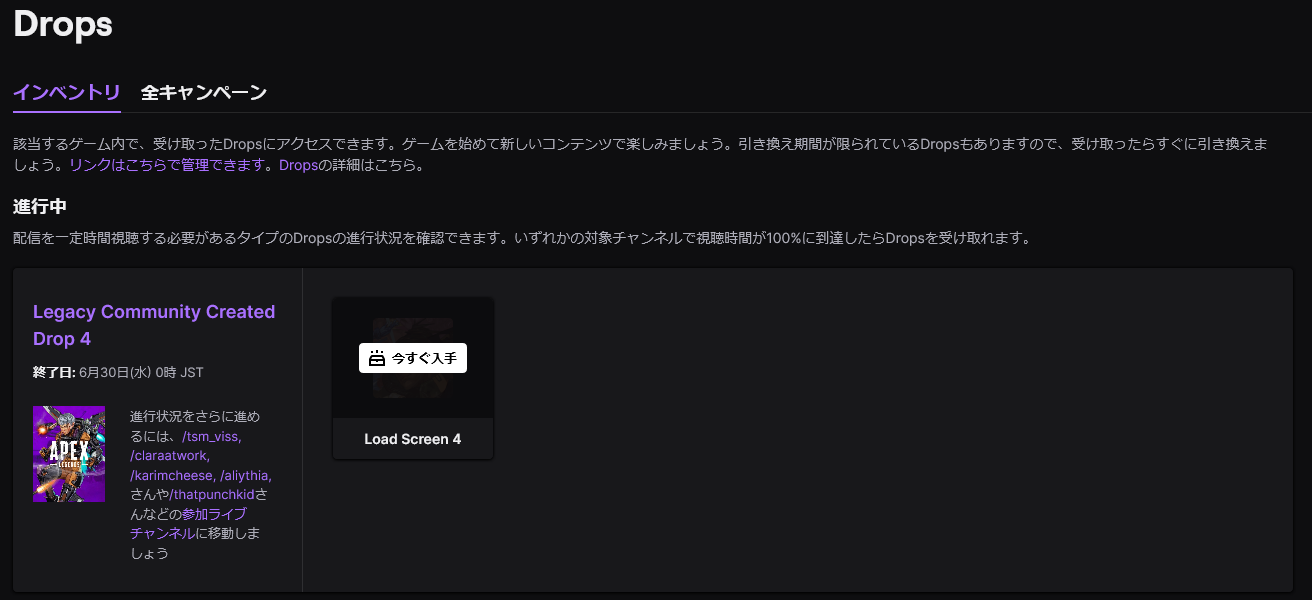 TwitchのDropメニューから進捗状況の確認やアイテムの受け取りが可能です。