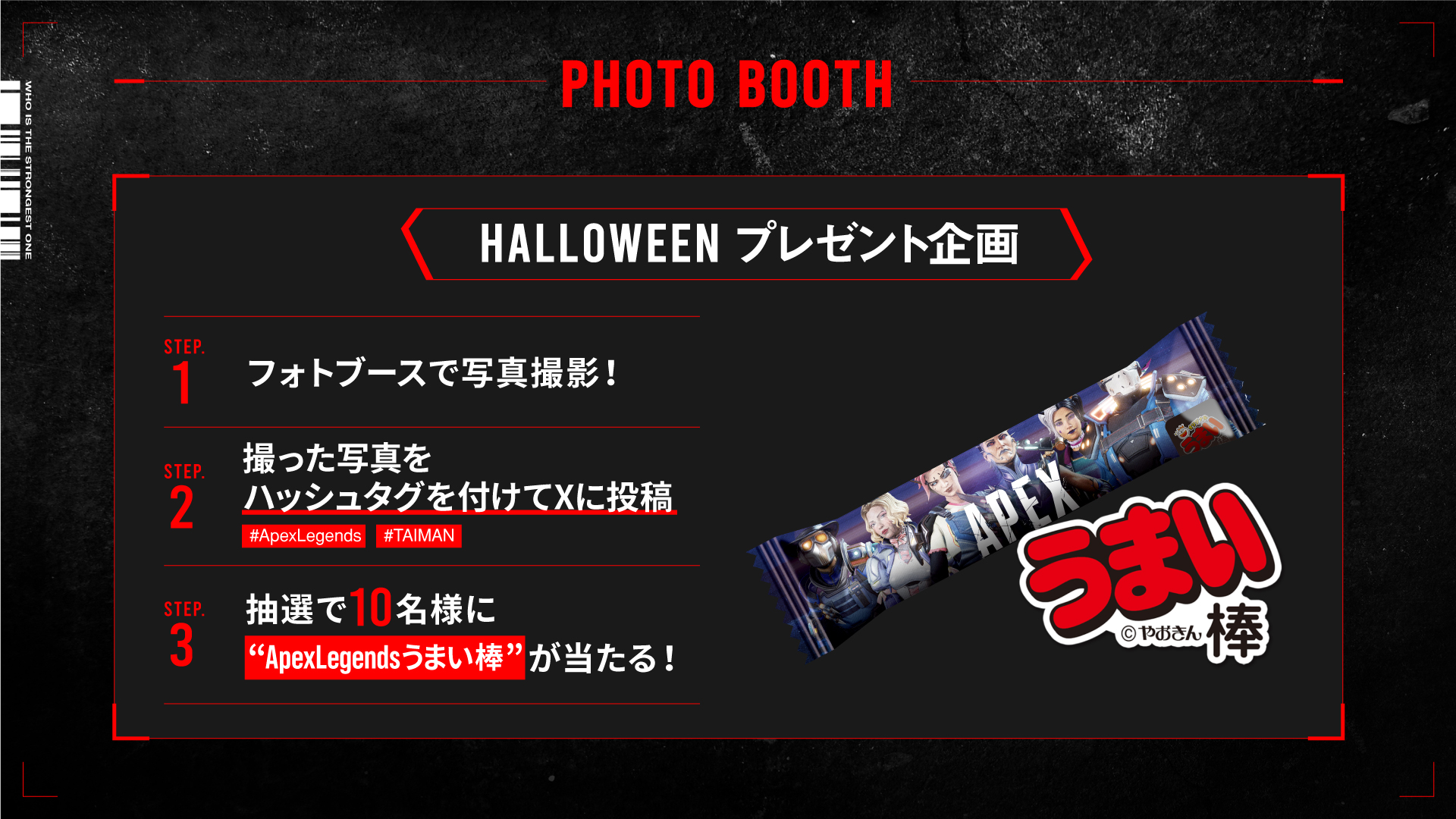会場にあるフォトブースでLEGENDSと一緒に写真を撮影! #APEXLEGENDS と #TAIMAN+ をつけて、X(twitter) に投稿しよう!抽選で10名様にAPEX LEGENDSうまい棒をプレゼント!