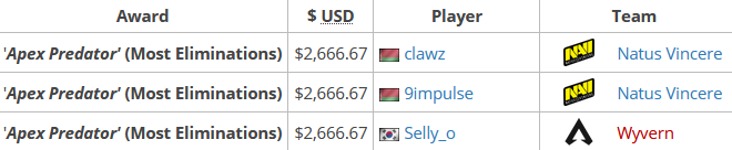NaViよりclawz選手,9impulse選手、WyvernよりSelly_o選手がMVPに選ばれ、$2,666(日本円約29万円)を獲得しました。