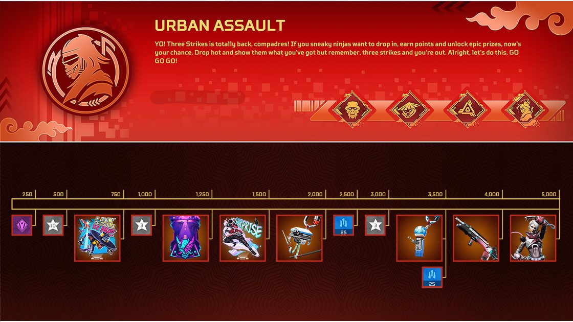 レジェンドの皆さん、総力戦が展開されるアーバンアサルトに備えましょう。スリーストライクが復刻。さらに独立したランキングを持つ新たなトーナメントシステム「Apexランブル」が登場します。競争心を駆り立て、ポイントを獲得してランキング上位を目指しましょう。そこには栄光と報酬が待っています! チャレンジに挑み、数々のアイテムが用意された報酬トラッカーを先に進めて、新イベントバッジや追加の報酬を手に入れましょう。期間限定のイベント装飾アイテム24種でストリートへ突撃。イベントが終了する前に期間限定アイテムをすべてアンロックして、オクタン用プレステージスキン「Apexリップタイド」を受け取ろう!