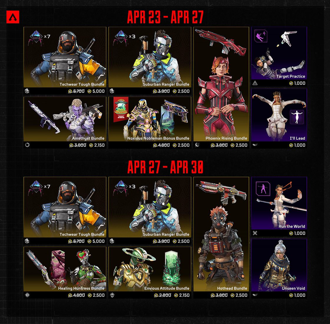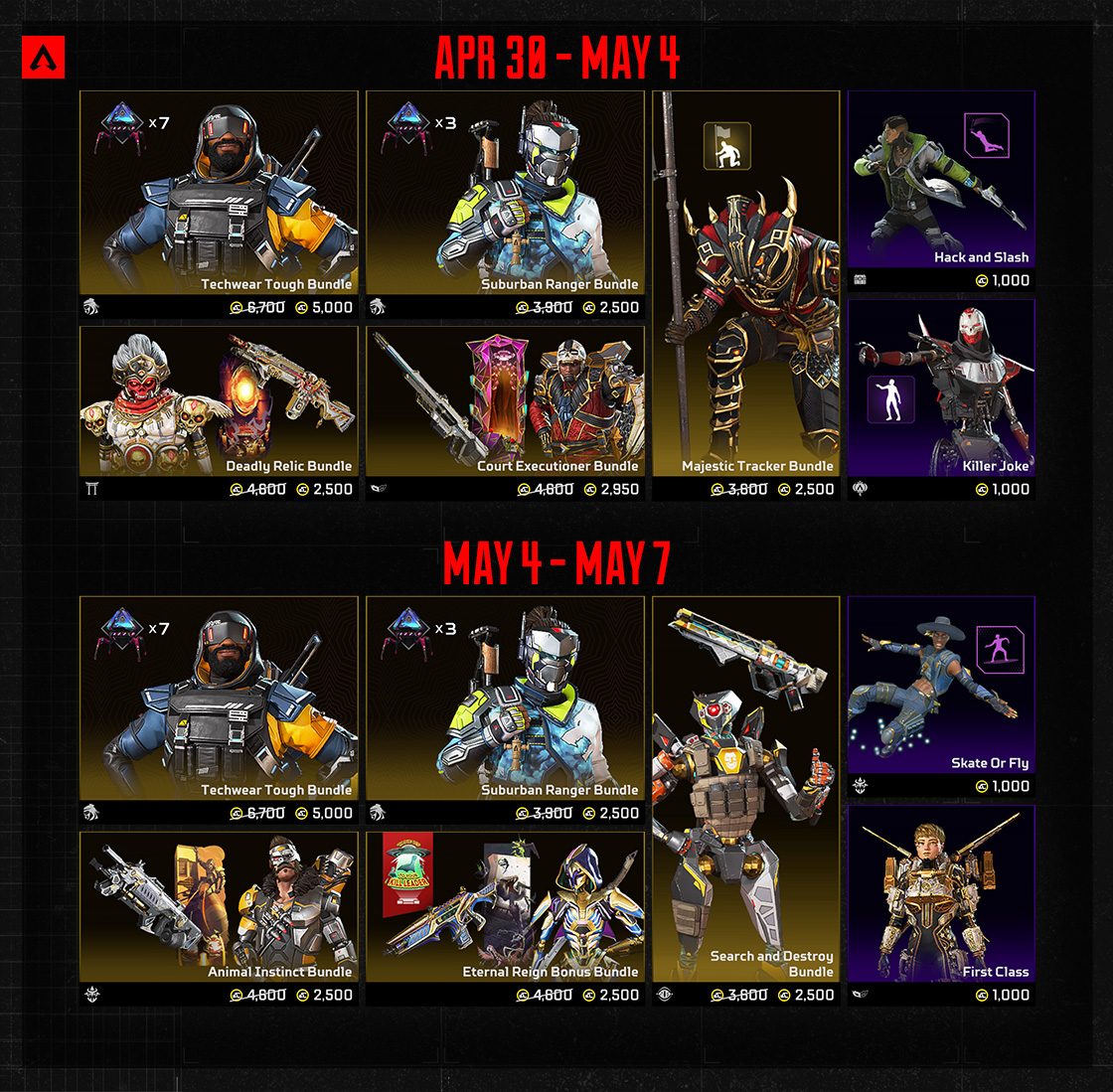 イベント期間中は、全24種類のアイテムをApexコインまたはクラフトメタルと交換して入手することも、アーバンアサルトトイベントのApexパックから入手することもできます。